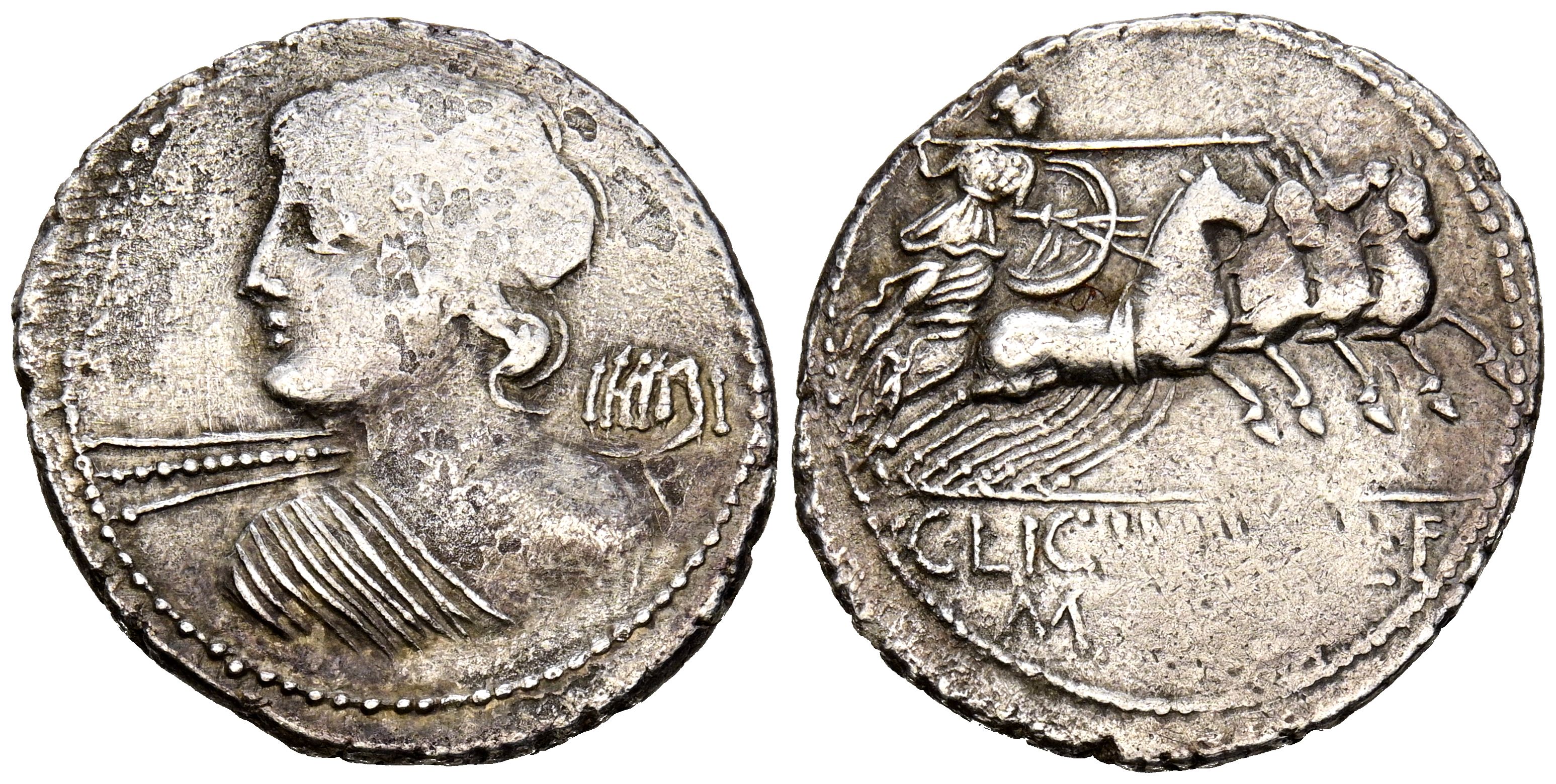 English GENS LICINIA. Denarius. (Ar. 3.90g/22mm). 84 Fine. Auxiliary workshop in Rome. (FFC 803; Crawford 354/1). Obv: Diademed bust of Apollo facing left with a bundle of lightning bolts in his hand. Rev: Minerva in quadriga with spear and shield facing right, in exergue: C LICINIVS LF/MACER. VF. Weak minting. Oxidations cleaned.