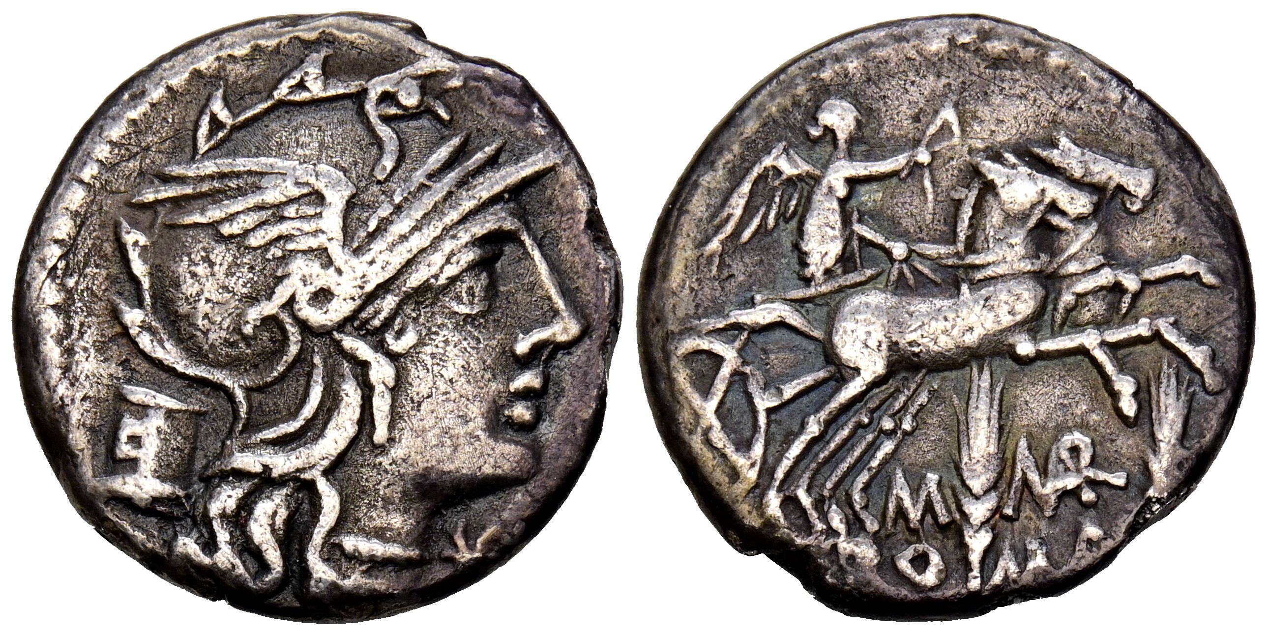 English GENS MAGoodIA. Denarius. (Ar. 3.51g/18mm). 134 Fine Rome. (FFC 850; Crawford 245/1). Obv: Head of Rome facing right, star in front, modius behind. Rev: Victory with a whip driving a biga to the right, below two ears of wheat with the legend between them: M MAR C/ROMA. VF-.