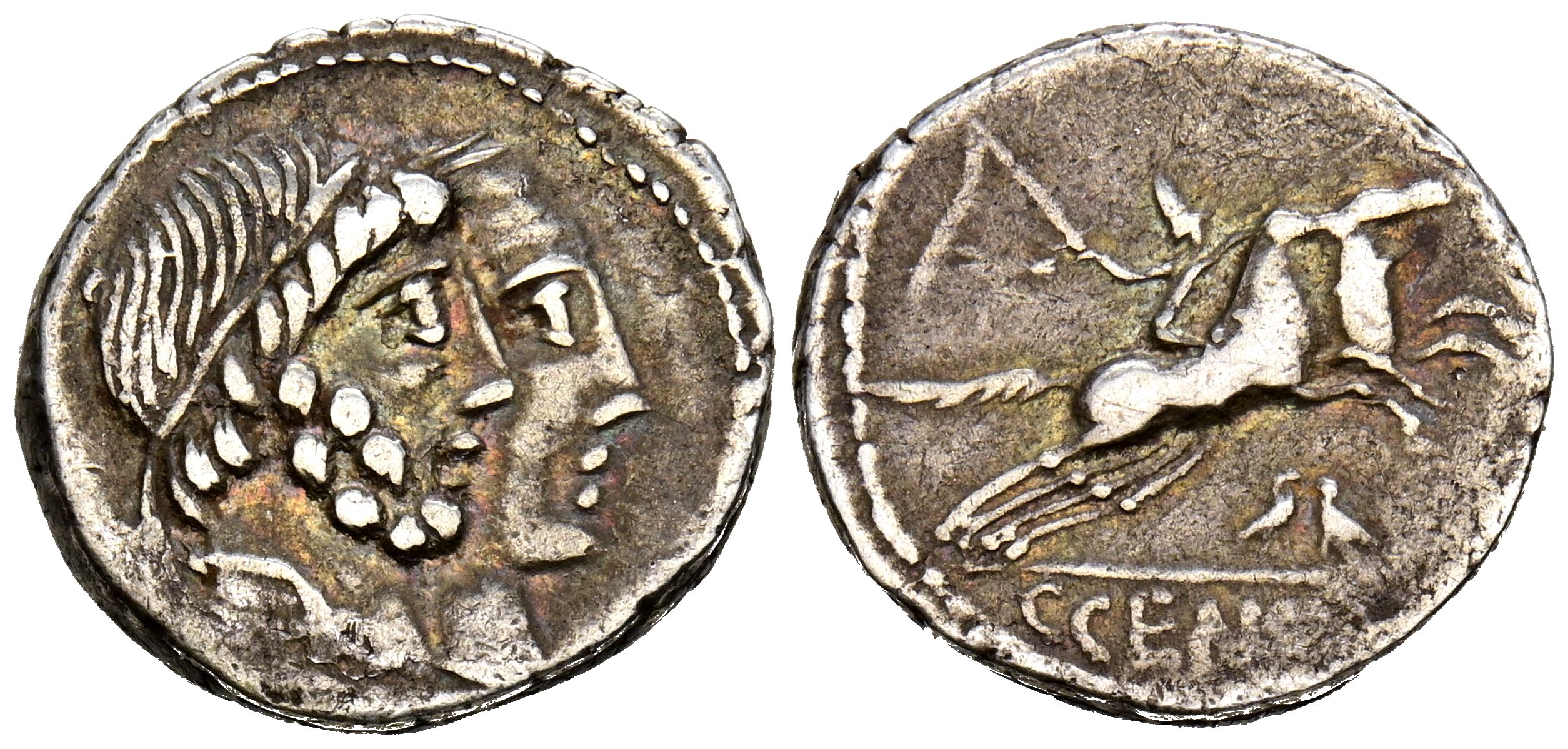 GENS MAGoodIA. Denarius. (Ar. 3.29g/17mm). 88 Fine. Uncertain mintage. (FFC 854; Crawford 346/1d). Obv: Diademed and juxtaposed heads of Numa Pompilius and Ancus Marcius facing right. Rev: Horseman with whip, leading another horse to the right, below two facing birds, in exergue: CENSUS C. VF.