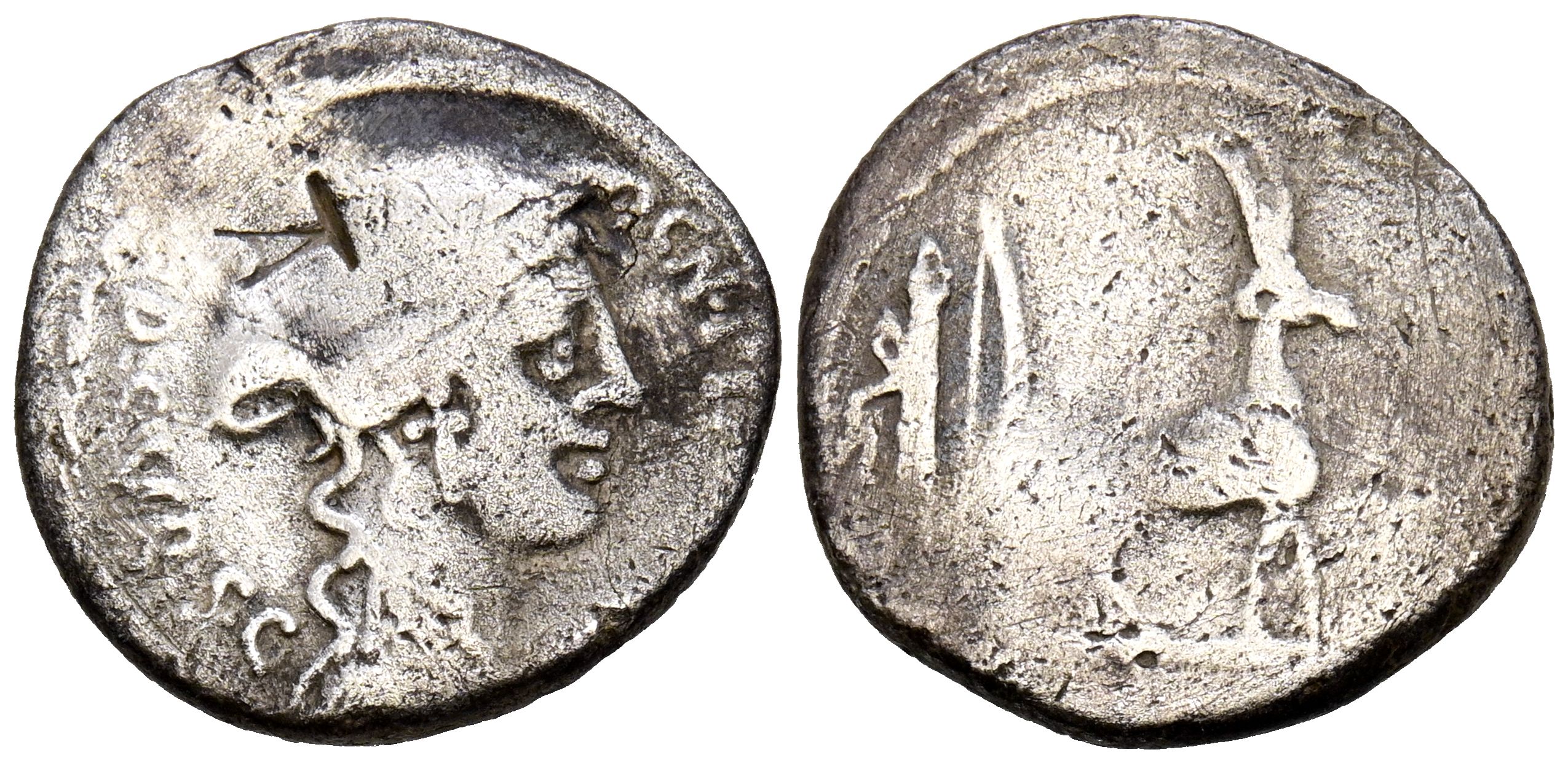 English GENS PLANCIA. Denarius. (Ar. 3.36g/19mm). 55 Fine Rome. (FFC 991; Crawford 432/1). Obv: Head of Diana Planciana facing right, surrounding legend: CN PLANCIVS AED CVR Uncirculated. Rev: Goat facing right, behind quiver and bow. Good Fine. Countermark on obverse.