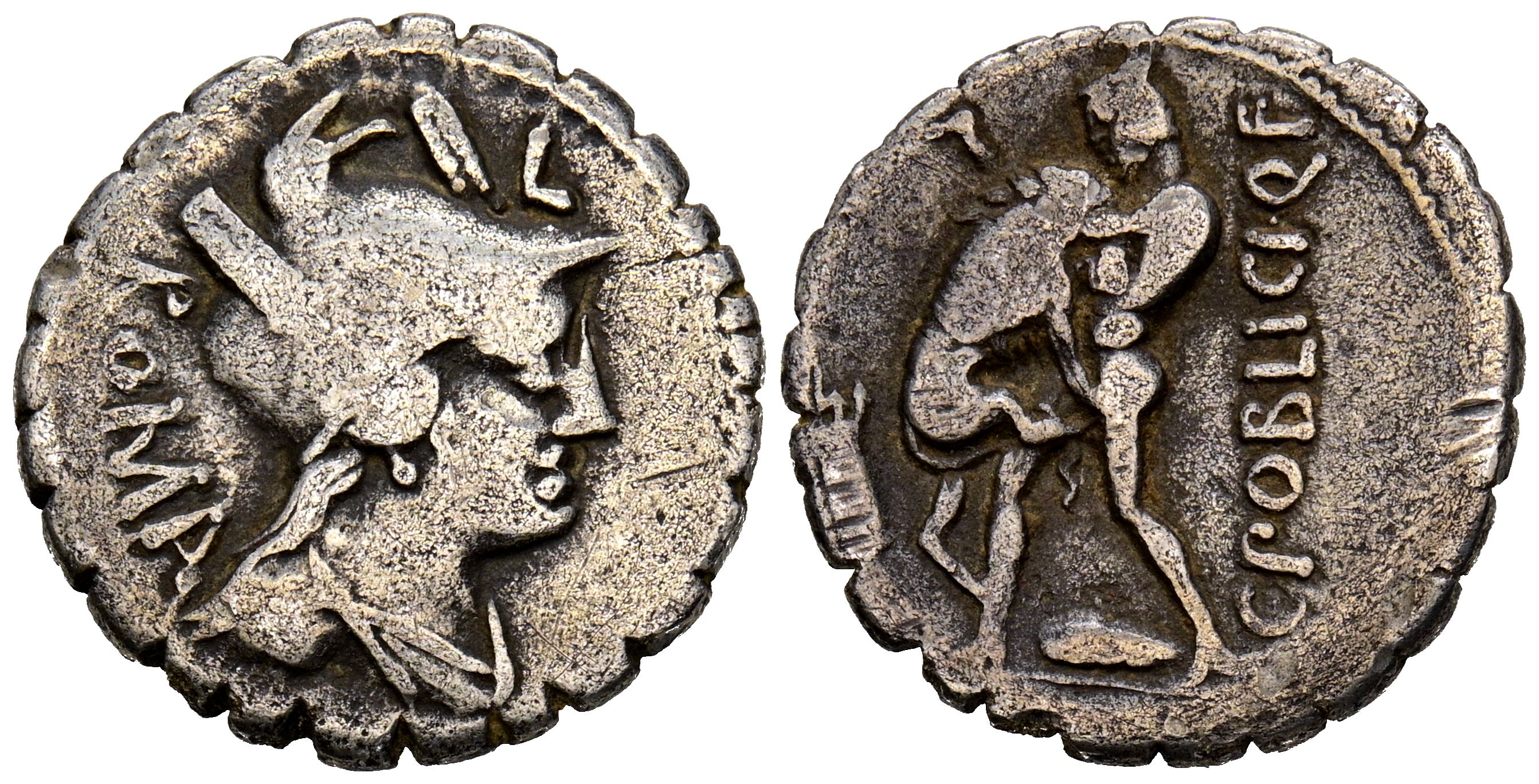 GENS POBLICIA. Denarius. (Ar. 3.66g/19mm). 80 Fine. Auxiliary workshop in Rome. (FFC 1017; Crawford 380/1). Obv: Head of Rome facing right, above: L, legend behind: ROME. Rev: Hercules standing left strangling the Nemean lion, front: mace, bow and quiver, above: L, legend behind: C POBLICI Q F. VF-.