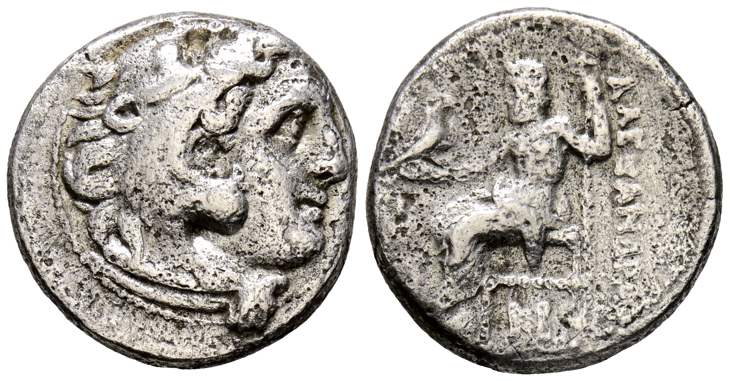 KINGS OF MACEDONIA, Alexander III the Great. Drachma. (Ar. 3.95g/17mm). 336-323 Fine Sardis. (Price 2563). Obv: Head of Heracles facing right, wearing a lion-skin headdress. Rev: Zeus seated on the left holding a sceptre and eagle, with monograms in front of and below the throne, and the Greek legend behind: AΛEΞANΔPOY. VF.