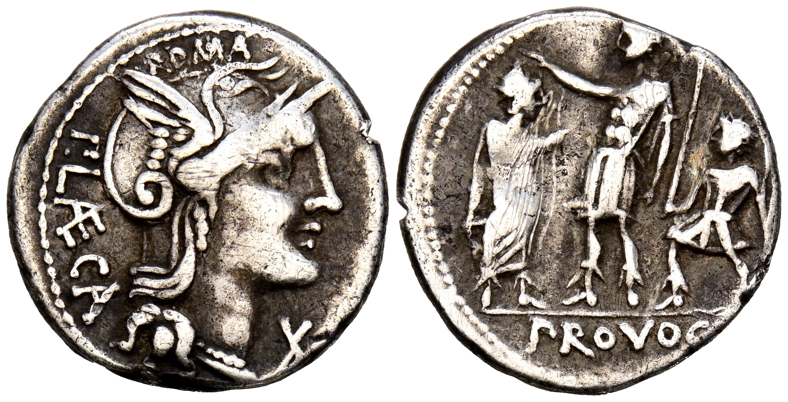 GENS POGoodIA. Denarius. (Ar. 3.84g/18mm). 110-109 Fine Rome. (FFC 1055; Crawford 301/1). Obv: Head of Rome facing right, star in front, legend behind: P LAECA. Rev: Roman soldier raising his right hand, citizen in toga in front, lictor with fasces behind, epigraph: PROVOCO. VF. Edge strike and cleaning lines on reverse.