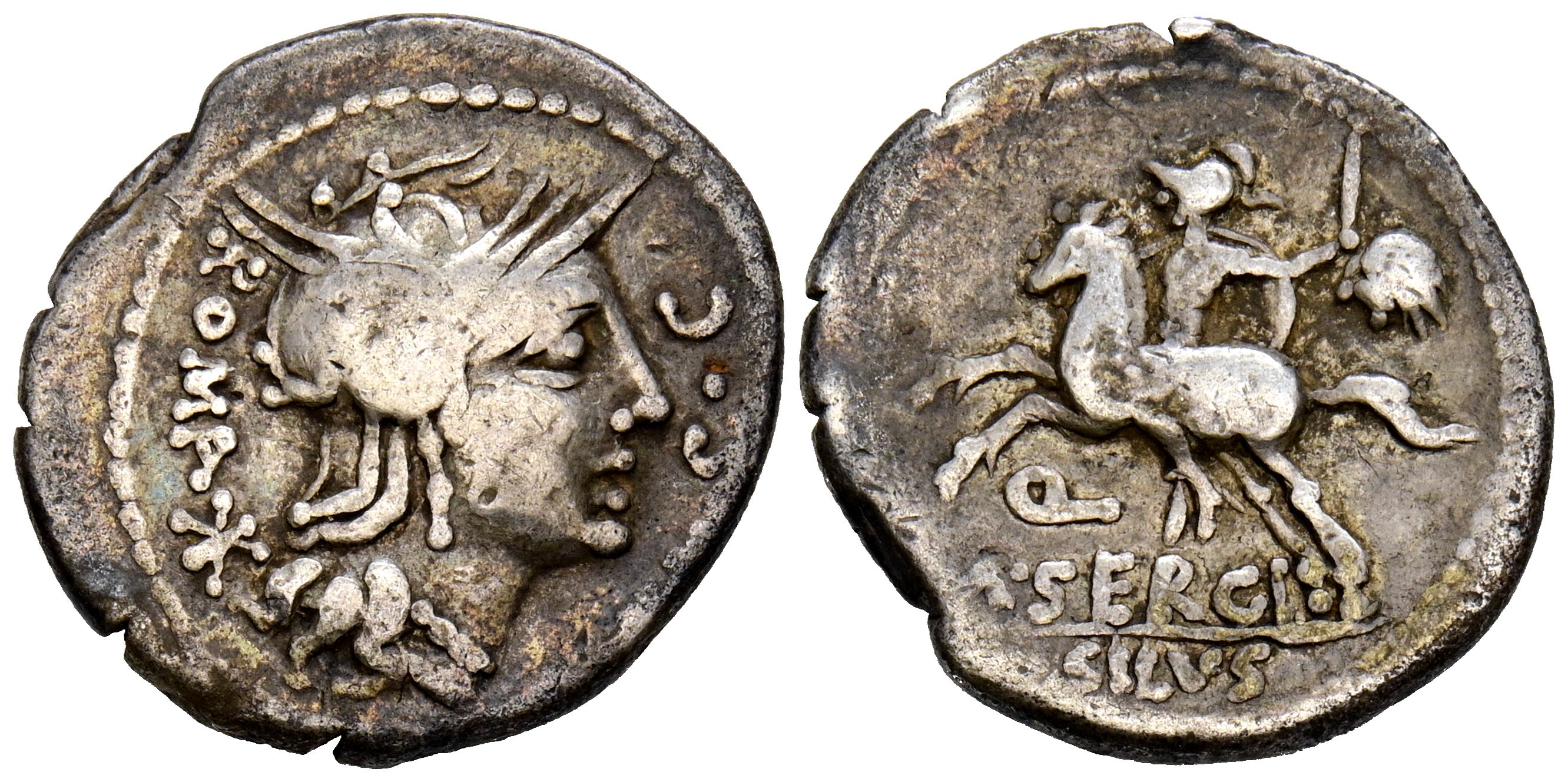English GENS SERGIA. Denarius. (Ar. 3.68g/19mm). 116-115 Fine Northern Italy. (FFC 1111; Crawford 286/1). Obv: Head of Rome facing right, behind a star and legend: ROMA, in front: EX Uncirculated. Rev: Horseman with sword facing left in a field with a Gaulish head, below the legend: QM SERGI, in exergue: SILVS. VF.