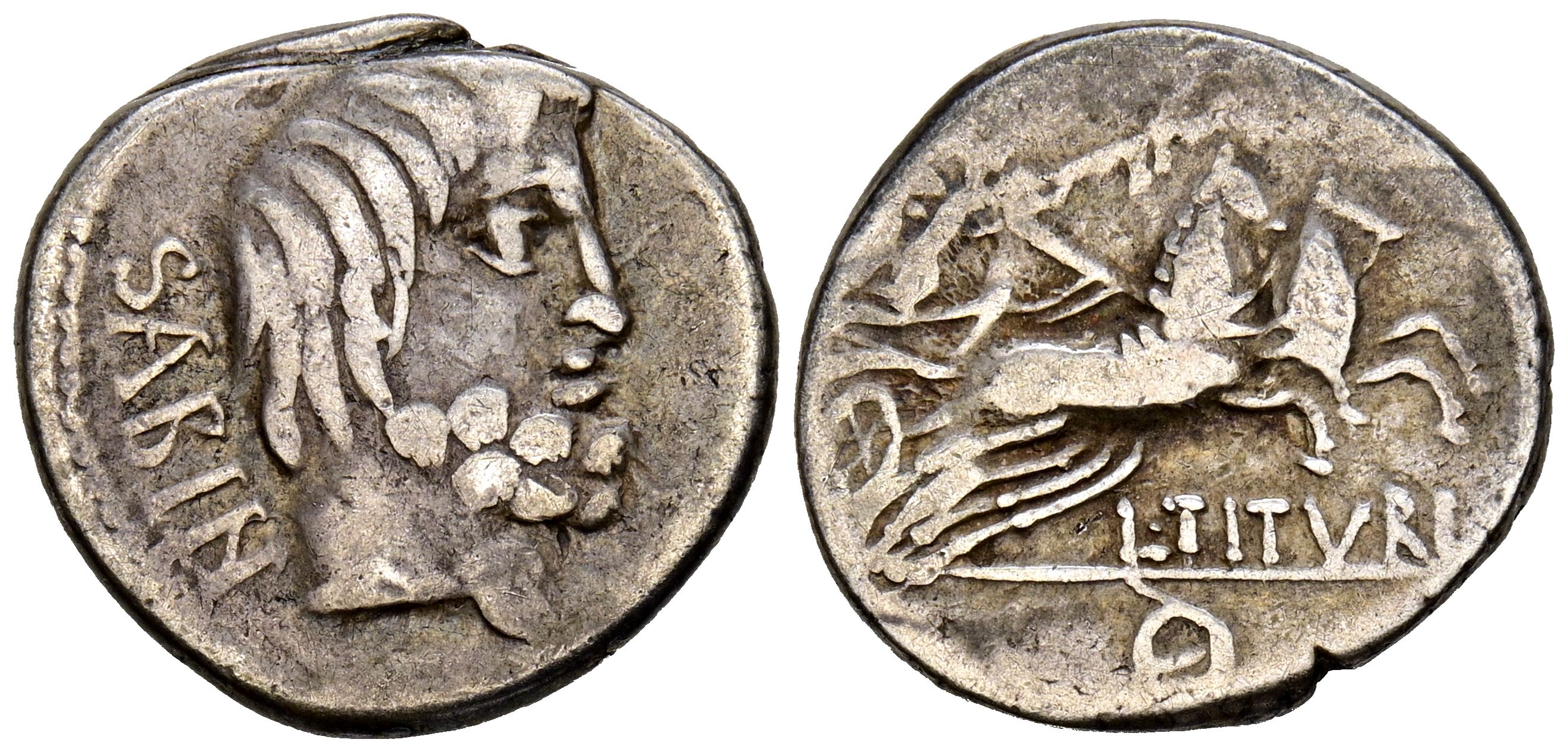 GENS TITURIA. Denarius. (Ar. 3.69g/18mm). 89 Fine Rome. (FFC 1149; Crawford 344/3). Obv: Head of Tatius facing right, legend behind: SABIN. Rev: Victory with crown on biga facing right, legend below: L TITVRI, in exergue: O. VF-.