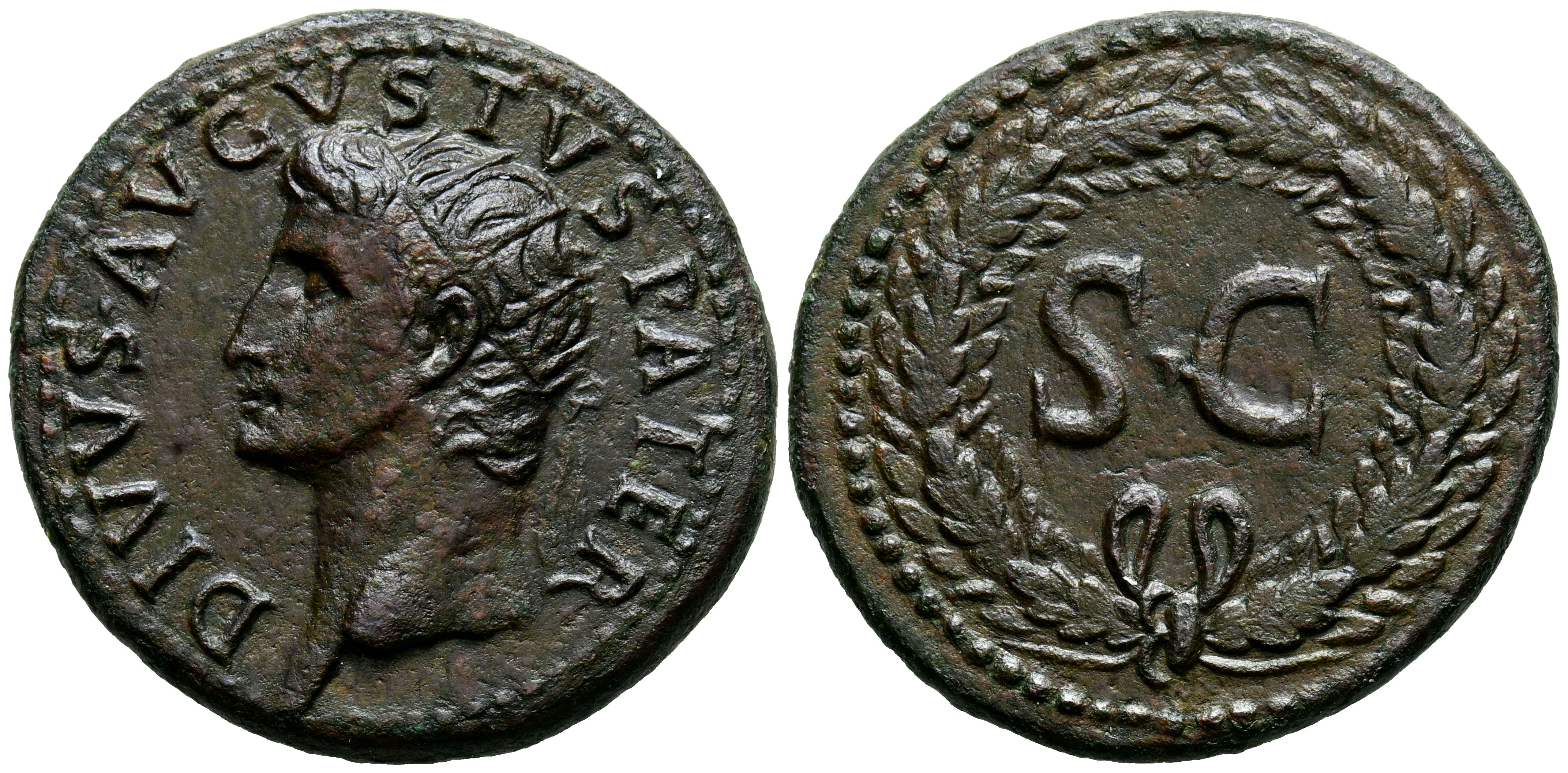 DIVO AUGUSTUS. Dupondius. (Ar. 13.84g/30mm). 22-26 AD Rome. (Minted under the name of Tiberius). Rome. (RIC 79). Obv: Radiated head of Augustus facing left, surrounding legend: DIVVS AVGVSTVS PATER. Rev: Uncirculated, within a laurel wreath. Extremely Fine-. Mechanical cleaning.