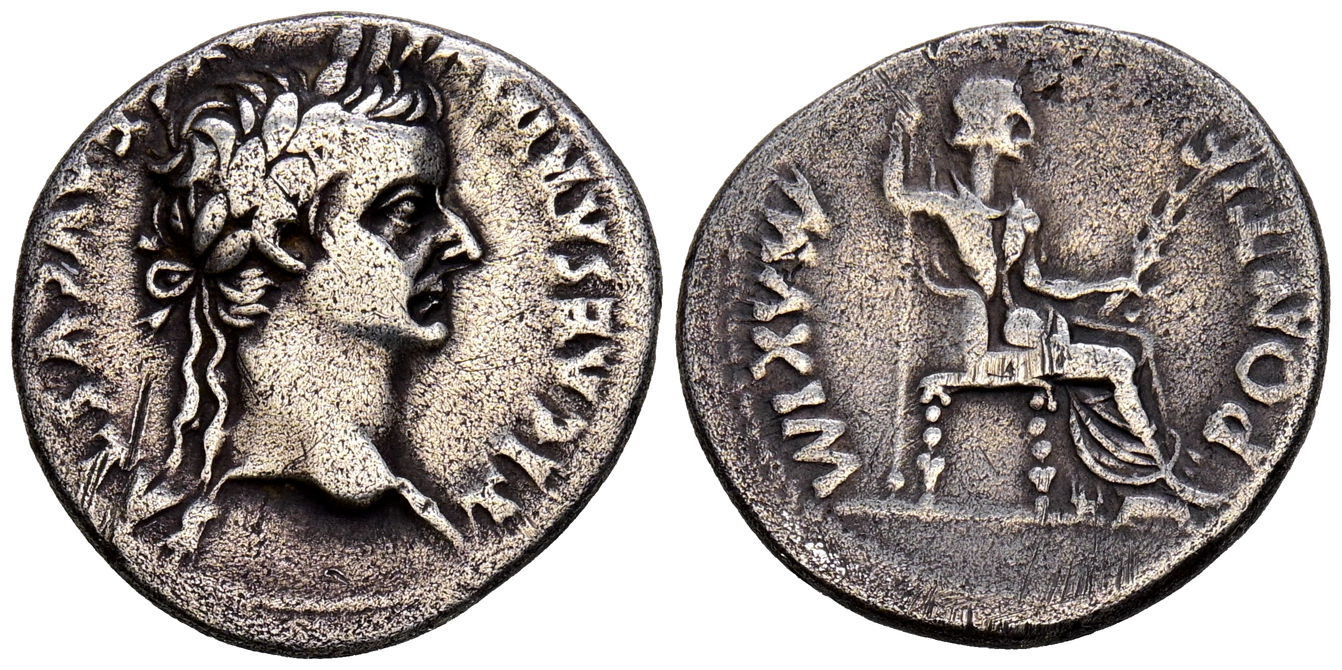 TIBERIUS. Denarius. (Ar. 3.53g/18mm). Lugdunum. 36-37 AD (RIC 30). Obv: Laureate head of Tiberius facing right, surrounding legend: TI CAESAR DIVI AVG F AVGVSTVS Rev: Livia seated facing right on a chair holding a scepter and olive branch PONTIF MAXIM. VF.