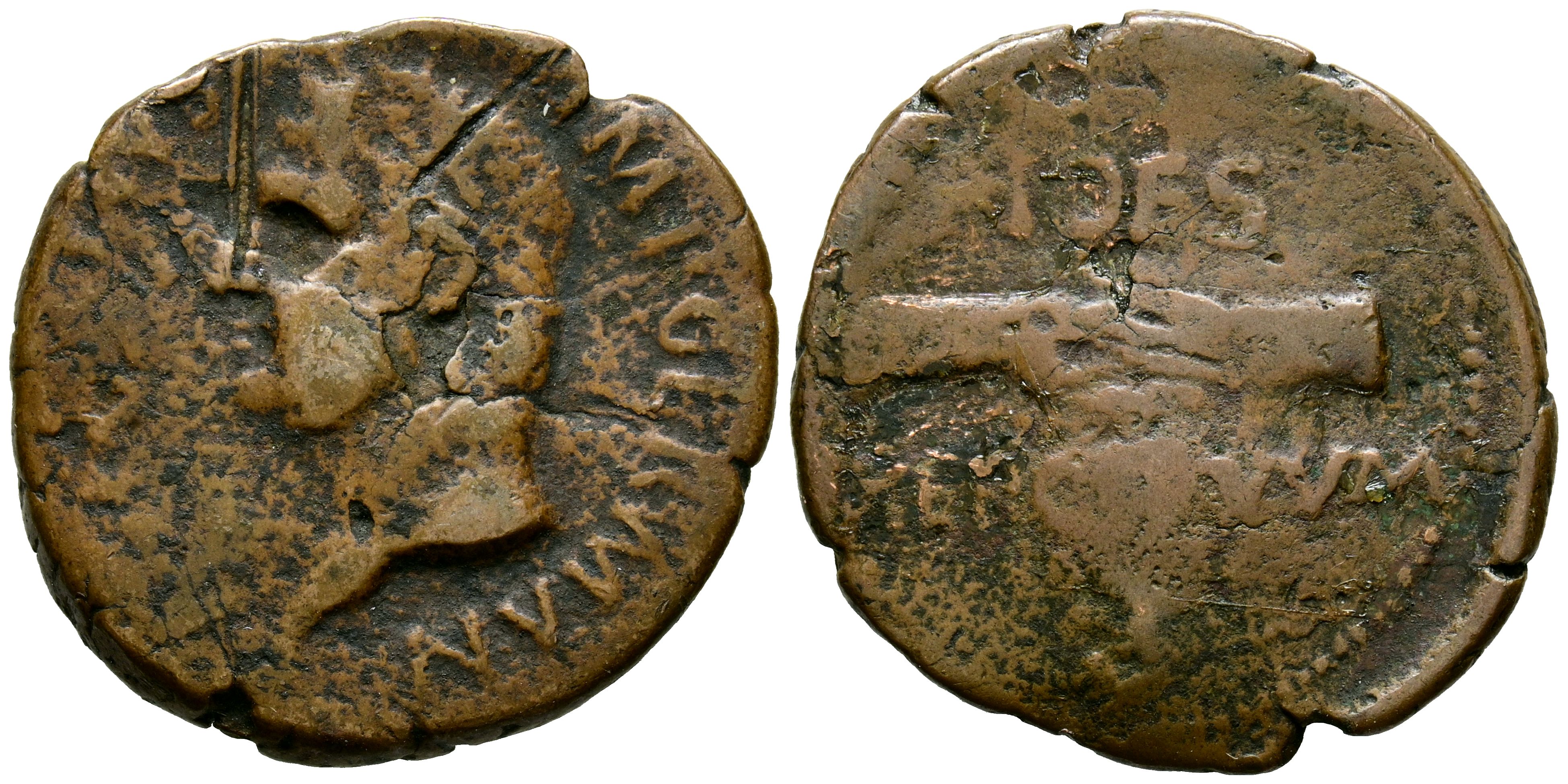 English VITELLIUS. As. (Ae. 8.43g/28mm). 69 AD Tarraco. (RIC 42). Obv: Laureate head of Vitellius facing left, with a globe at the tip of his neck, surrounding legend: A VITELLIVS IMP GERMAN. Rev: Hands clasped, surrounding legend: FIDES/EXEGoodITVVM/S C. Fine. Cleaned.