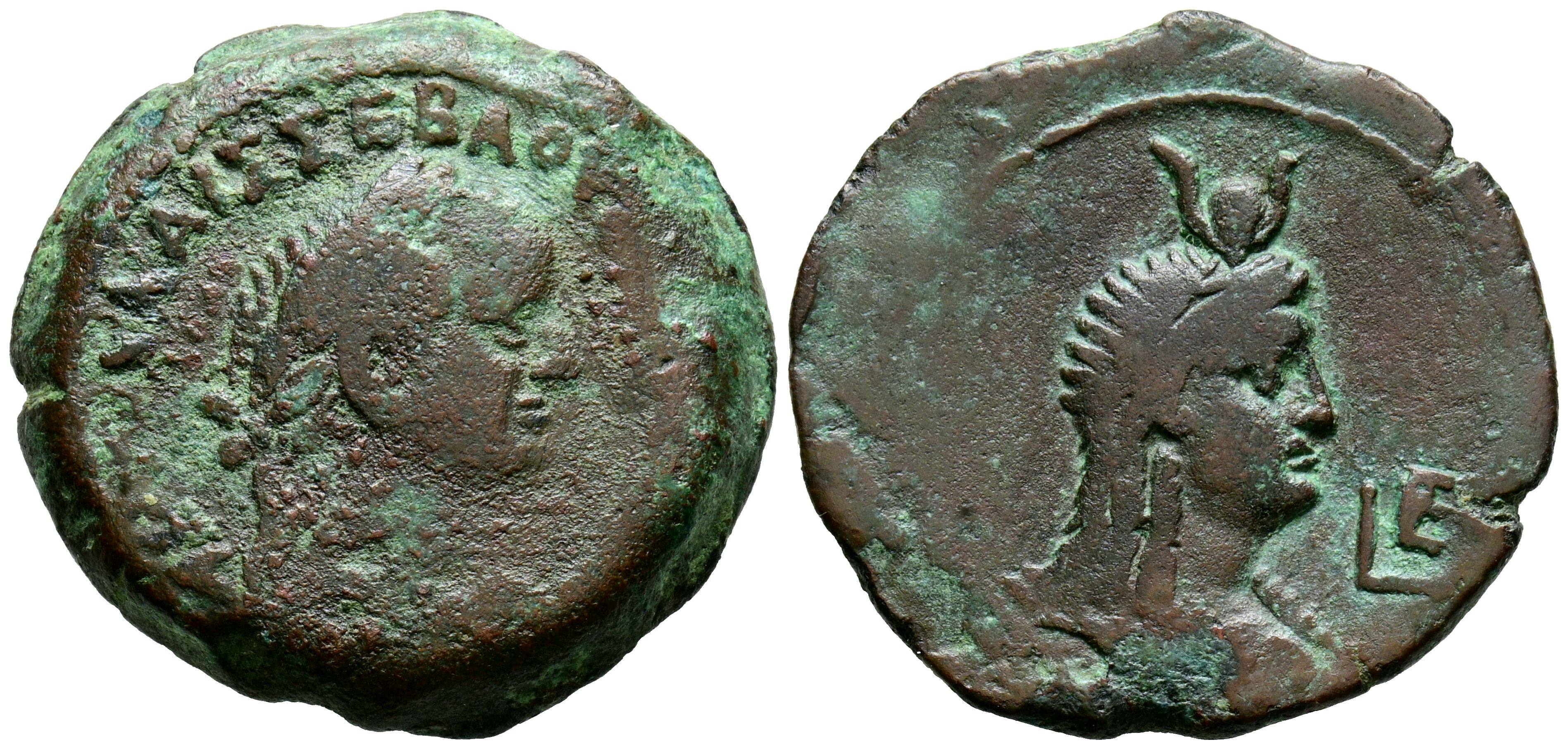 VESPASIAN. Diobolus. (Ae. 10.92g/26mm). 72-73 AD (Year 5). Obv: Laureate head of Vespasian facing right, legend around: ΑΥΤΟΚ ΚΑΙΣ ΣΕΒΑ ΟΥΕΣΠΑΣΙΑΝΟΥ. Rev: Draped bust of Isis with headdress facing right, front: LE. VF-.