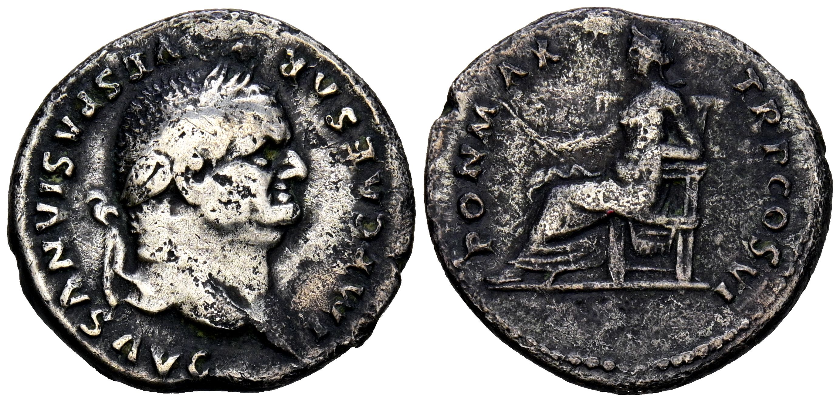 VESPASIAN. Denarius. (Ar. 3.19g/19mm). 75 AD Rome. (RIC 772). Obv: Laureate head of Vespasian facing right, surrounding legend: IMP CAESAR VESPASIANVS AVG. Rev: Pax seated facing left carrying a branch, surrounding legend: PON MAX TR P COS VI. Very Fine-.