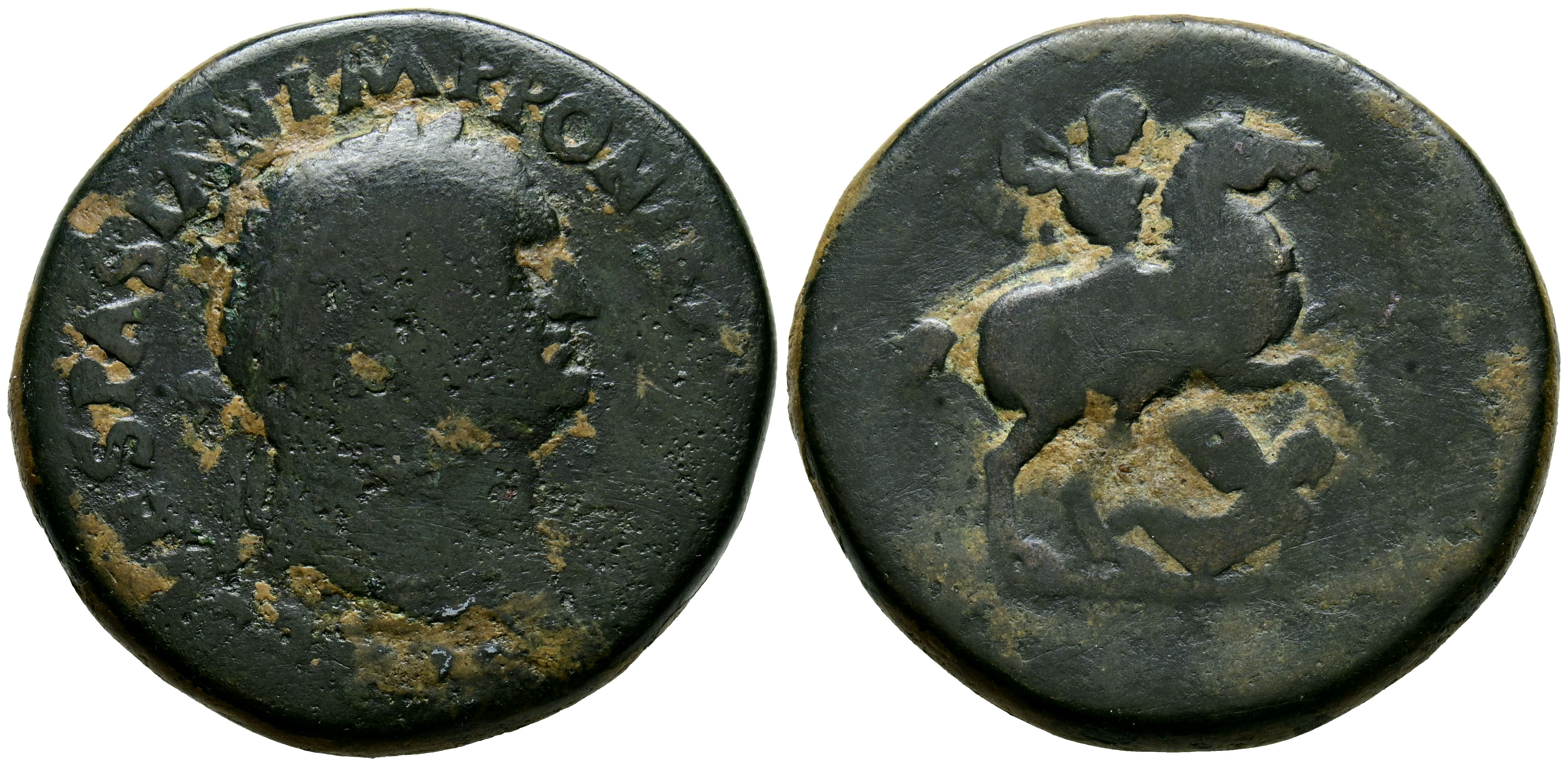 TITUS. Sestertius. (Ae. 21.97g/32mm). 72 AD Rome. (RIC 430). Obv: Laureate head of Titus facing right, surrounding legend: T CAES VESPASIAN IMP PON TR POT COS II. Rev: Titus in military attire on horseback facing right, spearing an enemy lying prostrate on the ground. Fine-. Rare specimen.