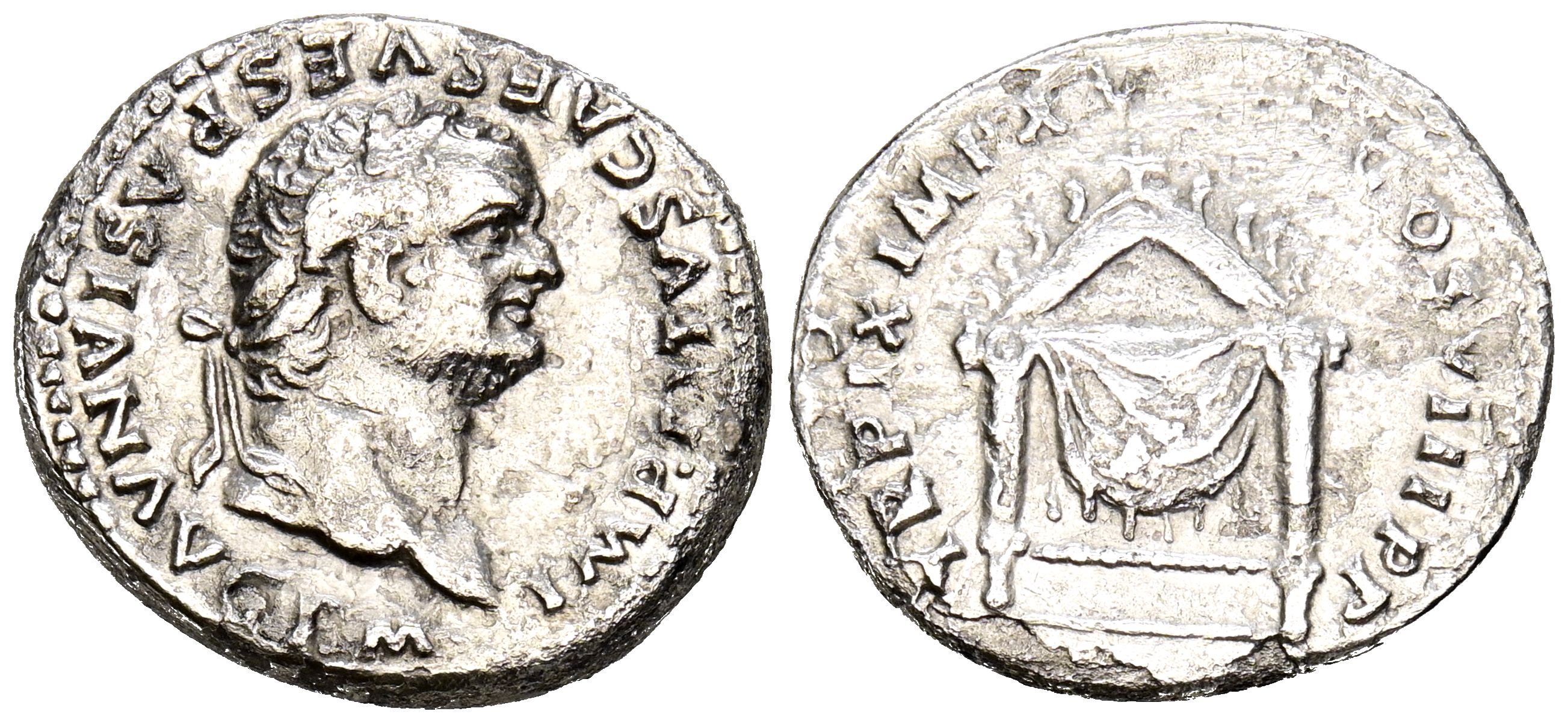 English TITUS. Denarius. (Ar. 3.20g/18mm). 80 AD Rome. (RIC 122). Obv: Laureate head of Titus facing right, surrounding legend: IMP TITVS CAES VESPASIAN AVG P M. Rev: Ornamented throne with triangular backrest, surrounding legend: TR P IX IMP XV COS VIII P P. VF.