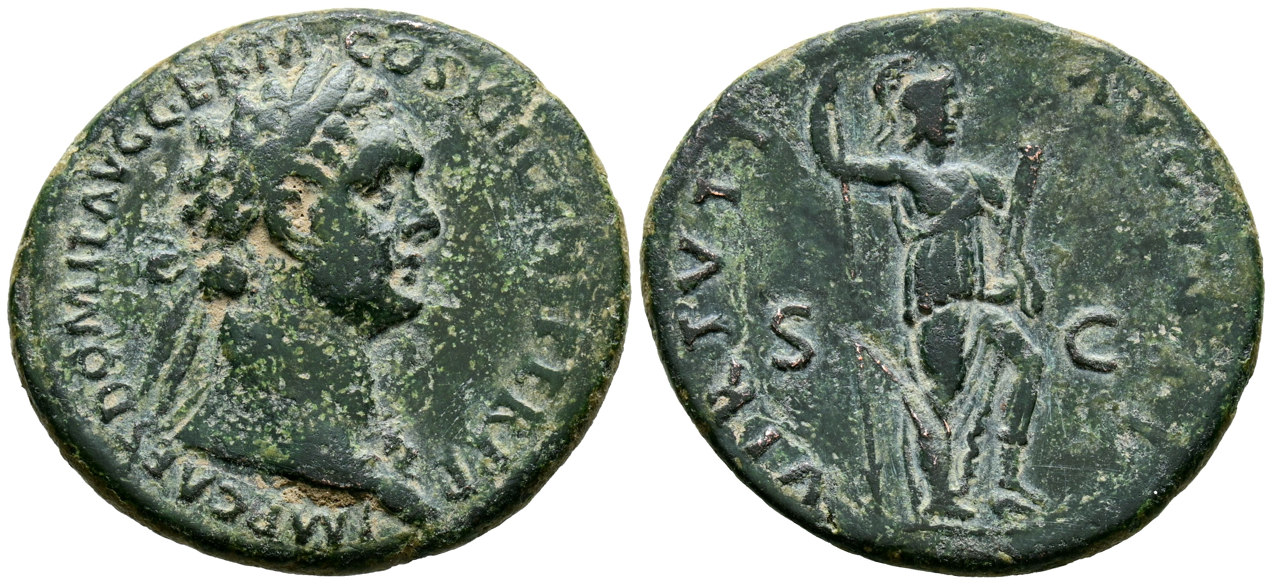 English DOMITIAN. As. (Ae. 9.18g/28mm). 95-96 AD Rome. (RIC 810). Obv: Laureate head of Domitian facing right, around legend: IMP CAES DOMI AVG GERM COS XVII CENS PER P P. Rev: Virtus standing right carrying spear and parazonium, between: Uncirculated, around legend: VIRTVTI AVGVSTI. VF-.