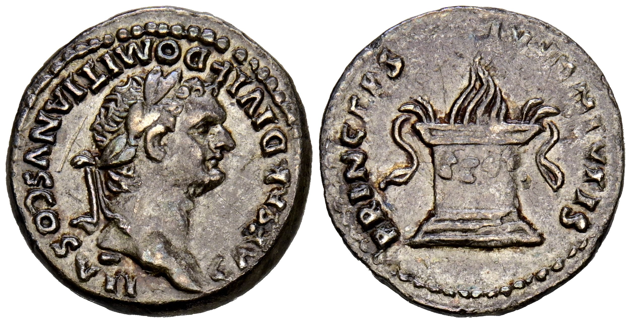 DOMITIAN. Denarius. (Ar. 3.27g/18mm). 80-81 AD Rome. (RIC 266). Obv: Laureate head of Domitian facing right, surrounding legend: CAESAR DIVI F DOMITIANVS COS VII. Rev: Altar, surrounding legend: PRINVEPS IVVENTVTIS. VF+.