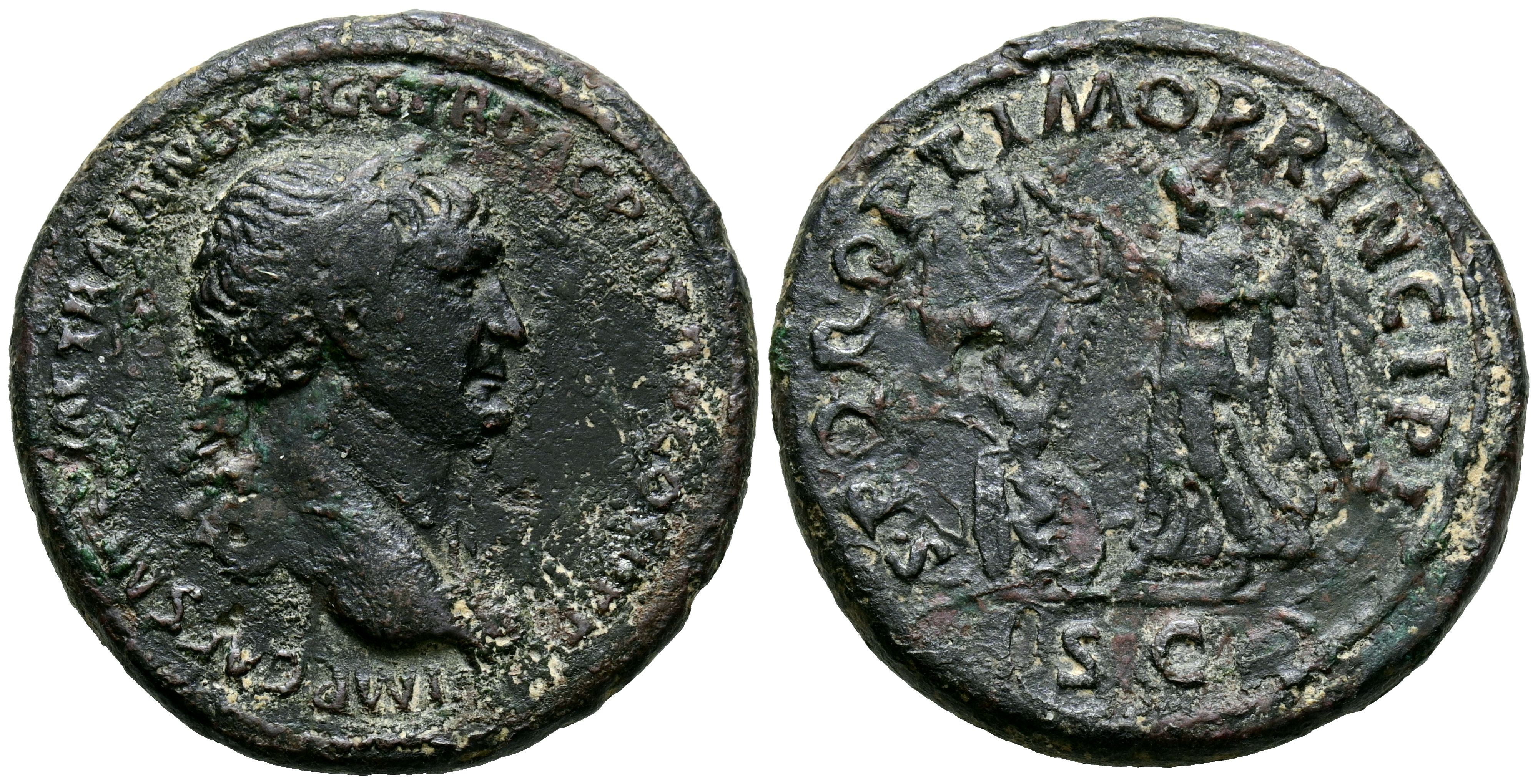 TRAJAN. As. (Ae. 12.88g/29mm). 103-111 AD (RIC 524, var). Obv: Laureate bust of Trajan facing right, around legend: IMP CAES NERVAE TRAIANO AVG GER DAC PM TR P COS VP P. Rev: Victory to the left holding a palm tree and erecting a trophy, in exergue: Uncirculated, around legend: SPQR OPTIMO PRINCIPI. VF-. Cleansed.