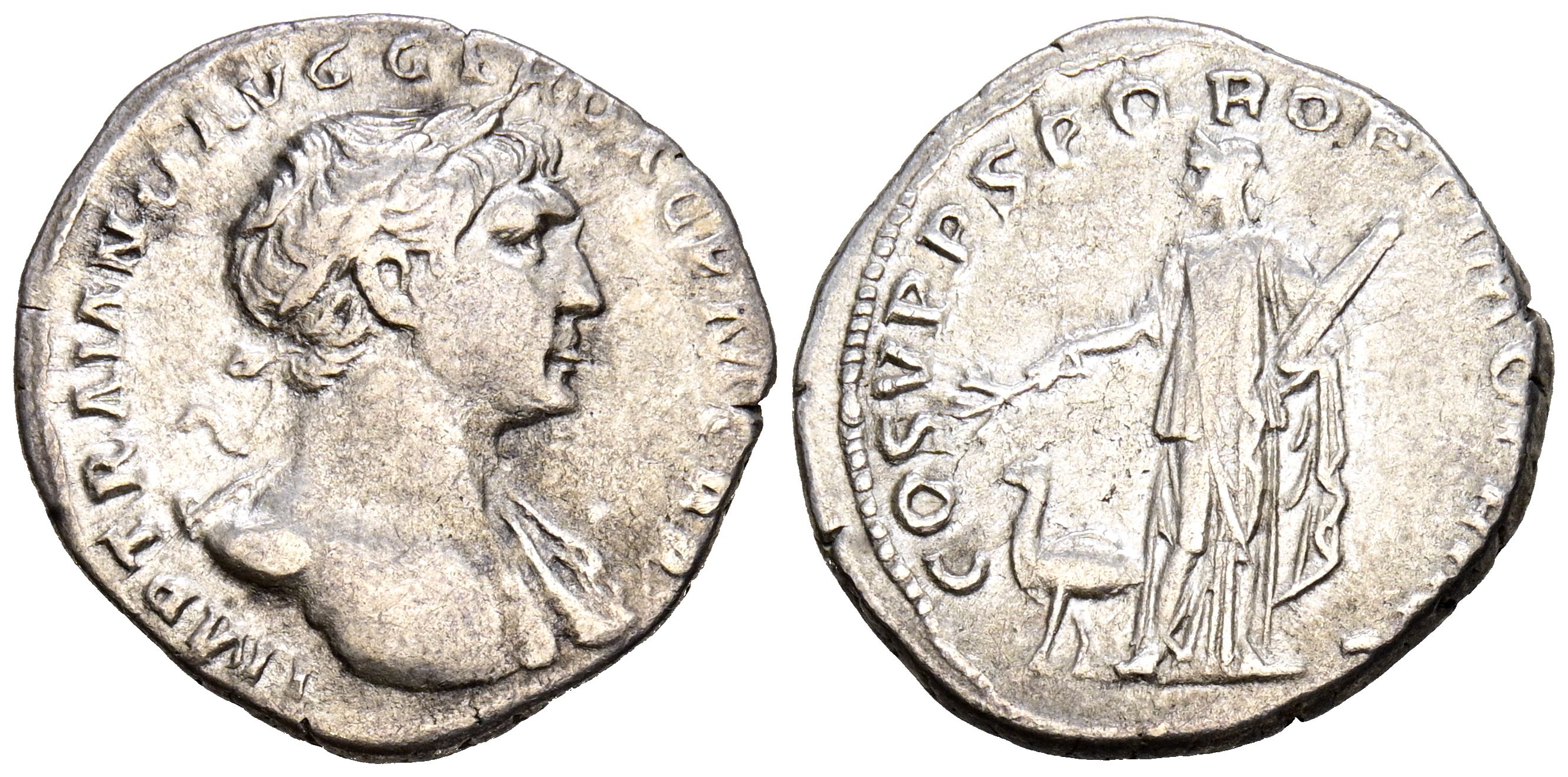 TRAJAN. Denarius. (Ar. 2.96g/18mm). 110 AD Rome. (RIC 142). Obv: Laureate bust of Trajan facing right with light drapery over left shoulder, surrounding legend: IMP TRAIANO AVG GER DAC PM TR P. Rev: Arabia standing left carrying a cinnamon stick and branch, with a camel at his feet, surrounding legend: COS VPP SPQR OPTIMO PRINC. VF.