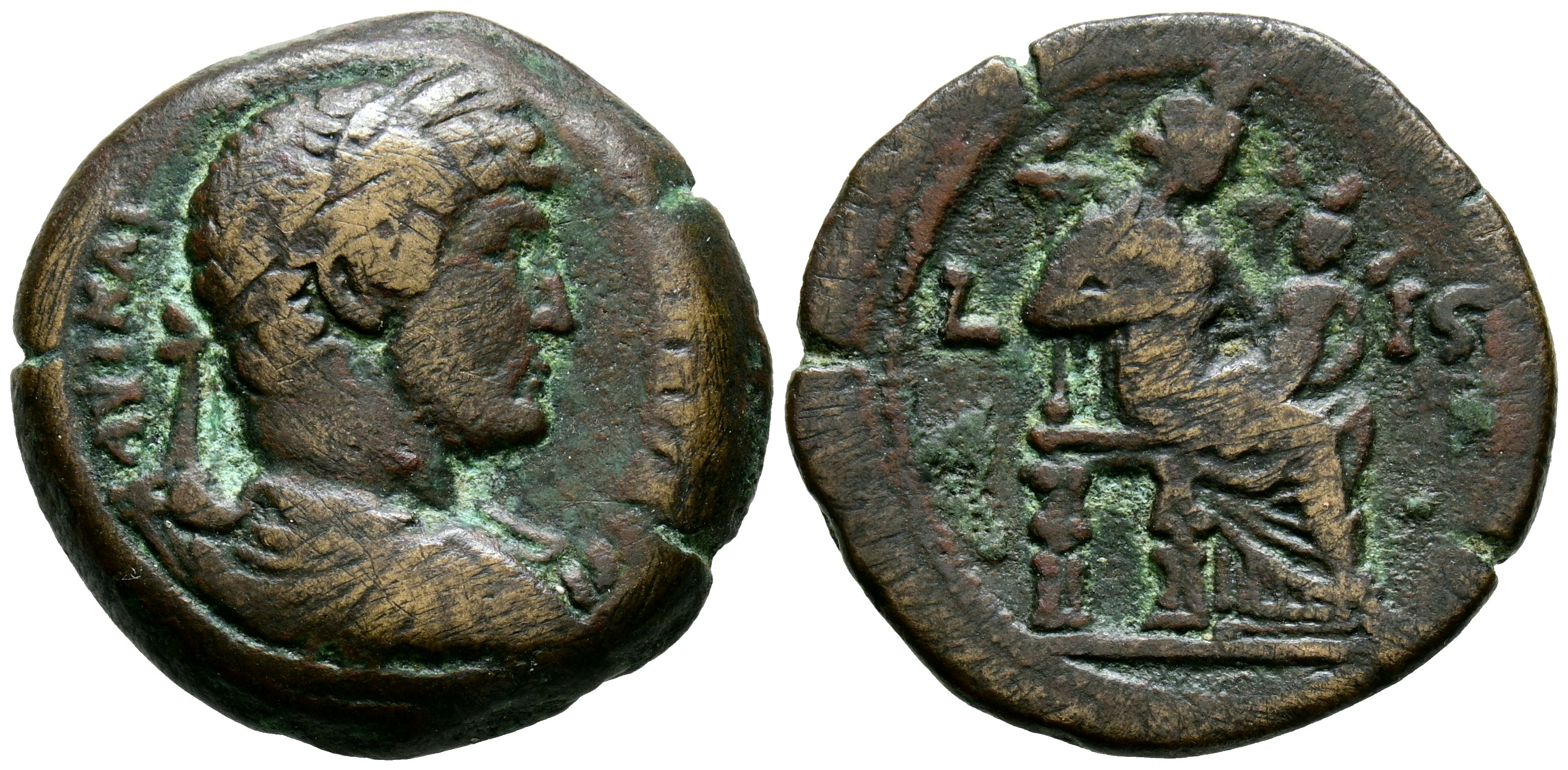 HADRIAN. Diobolus. (Ae. 10.09g/25mm). 131-132 AD (Year 16). Alexandria, Egypt. (RPC 5813; Dattari 1749). Obv: Laureate and draped bust of Hadrian facing right, around which is the Greek legend: AVT KAI TPAI AΔPIA CЄB. Rev: Isis seated facing right with the infant Harpocrates on her knees, field: L-IϚ. VF.