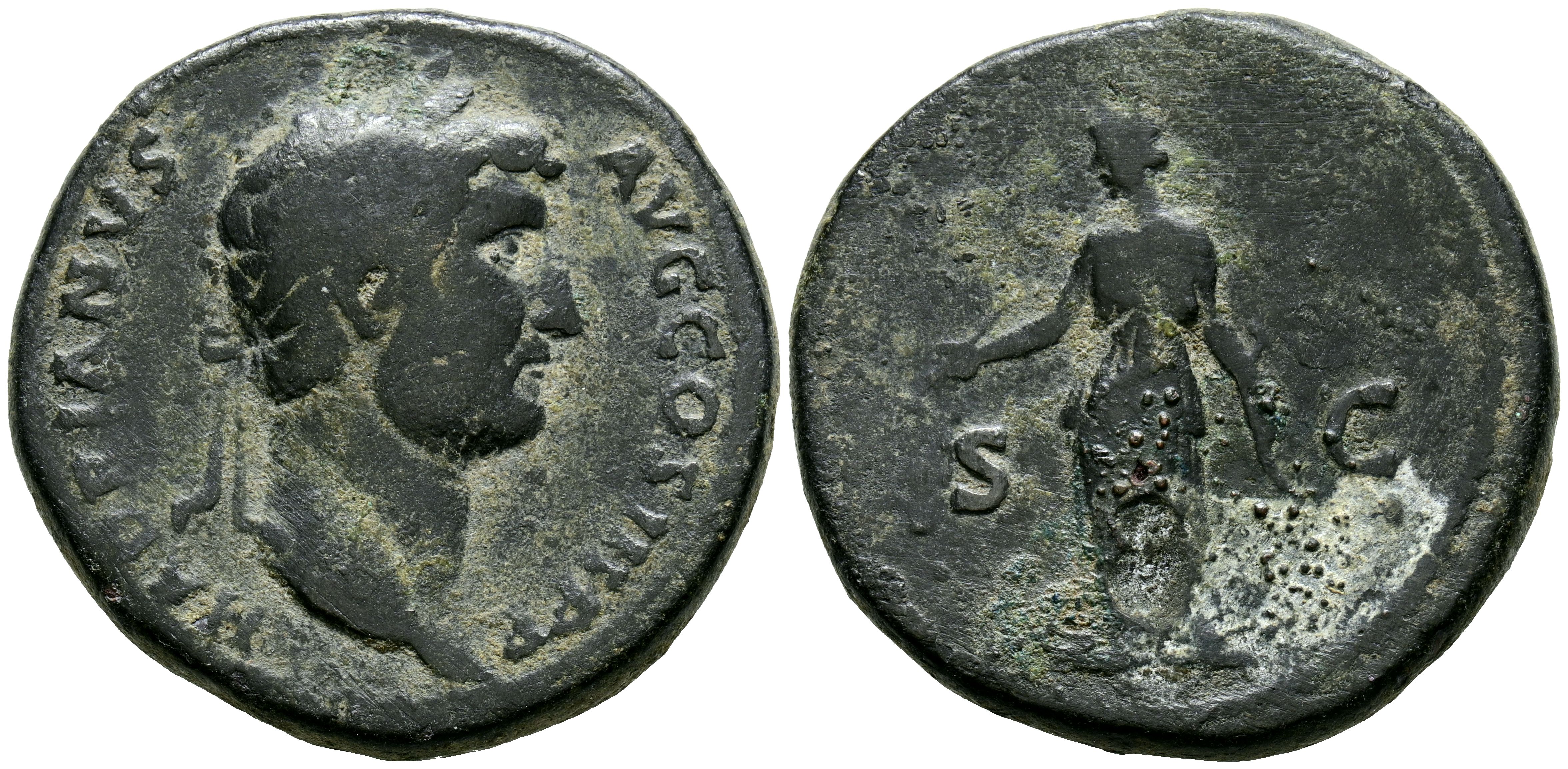 HADRIAN. Sestertius. (Ae. 24.61 g / 32 mm). 134-138 AD Rome. (RIC 777var). Obv: Laureate bust of Hadrian facing right, around the legend: HADRIANVS AVG COS III P P. Rev: Diana's stand facing left with bow and arrows, in Uncirculated field. VF-.