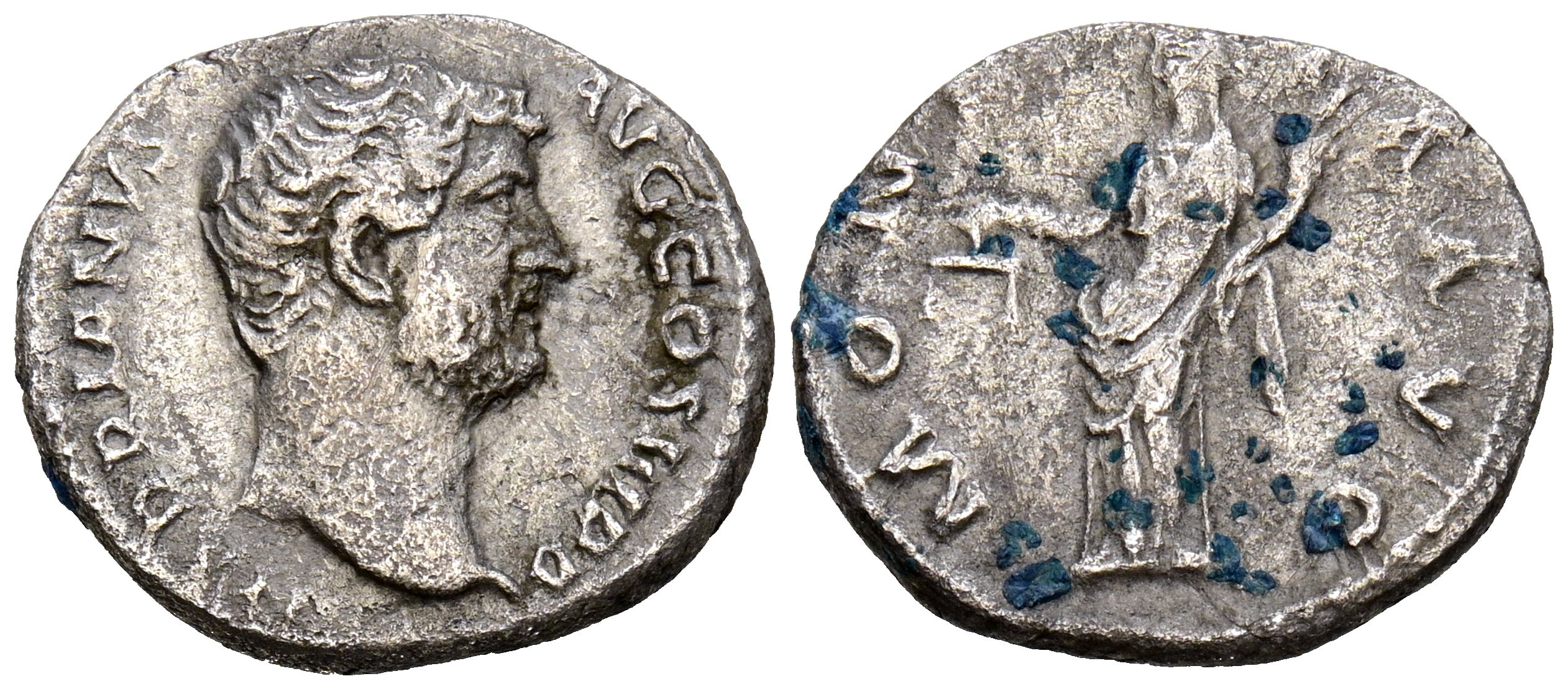 HADRIAN. Denarius. (Ar. 2.85g/18mm). 136 AD Rome. (RIC 2224). Obv: Head of Hadrian facing right, around legend: HADRIANVS AVG COS III P P. Rev: Coin standing left carrying scales and cornucopia, around legend: MONETA AVG. VF-. Oxidations.