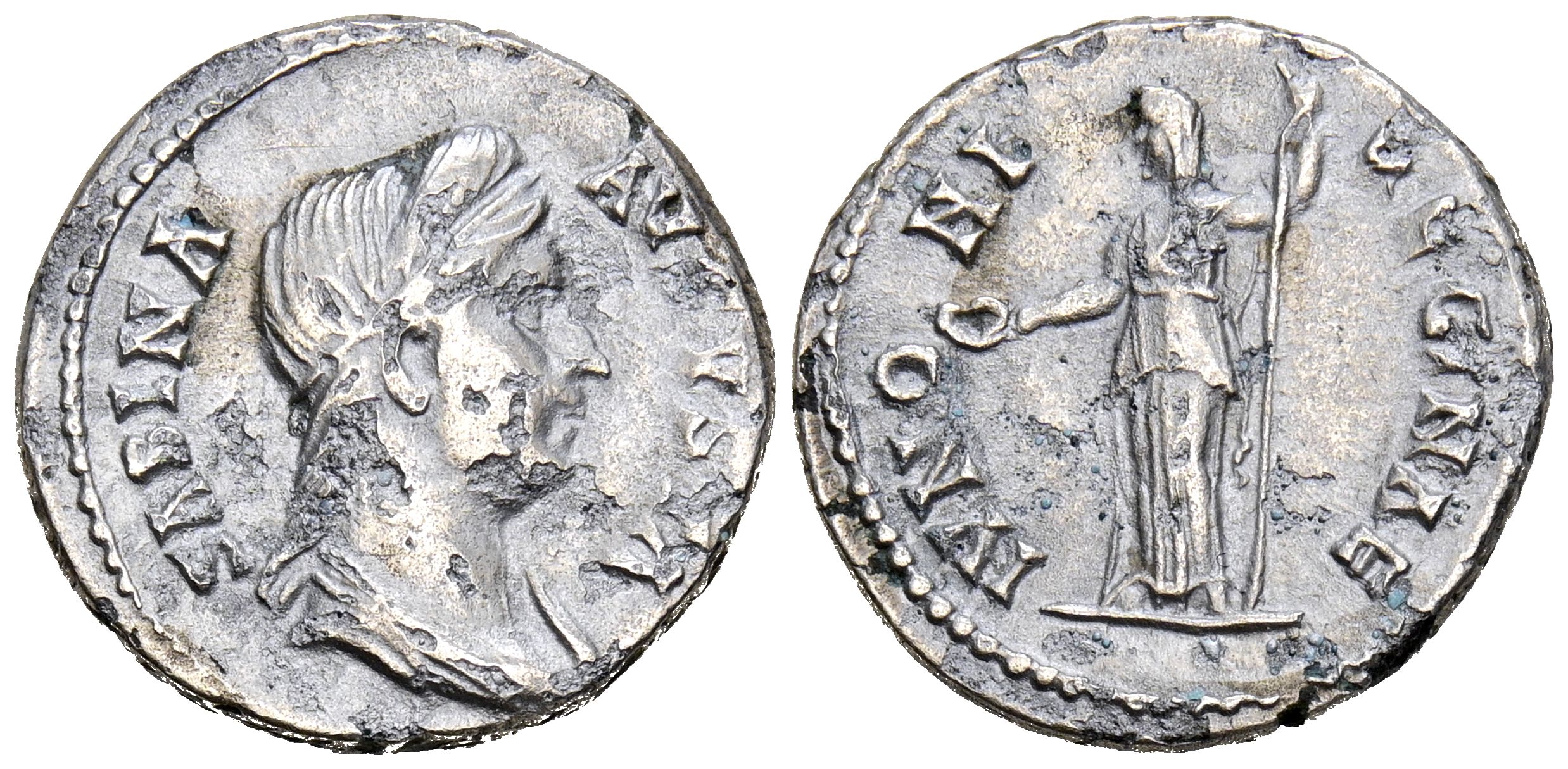 SABINA. Denarius. (Ar. 2.68g/17mm). 133-135 AD Rome. (RIC 2550). Obv: Diademed and draped bust of Sabina facing right, surrounding legend: SABINA AVGVSTA. Rev: Juno standing left carrying a small boat and sceptre, surrounding legend: IVNONI REGINAE. VF+. Oxidations cleaned.