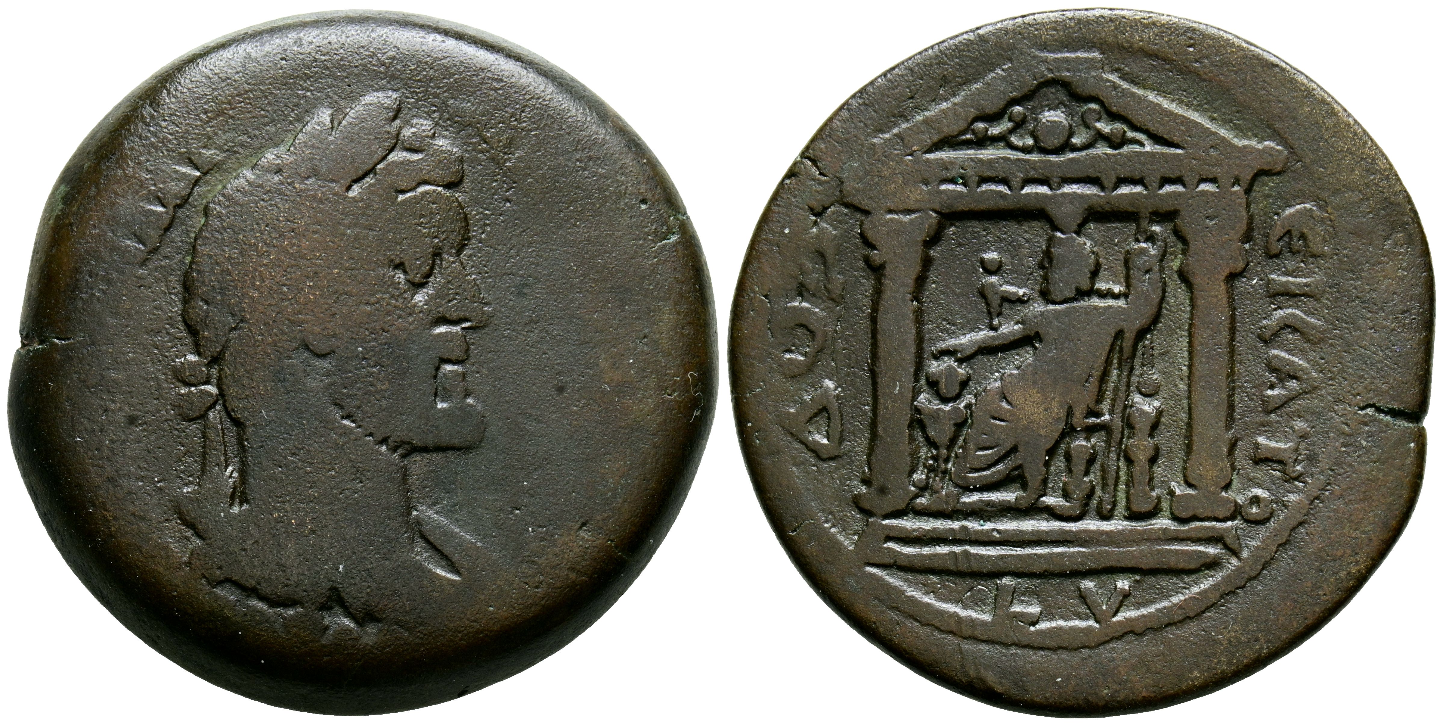 ANTONINUS PIUS. Drachma. (Ae. 26.23g/34mm). 148-149 AD (Year 12). Obv: Laureate bust of Antoninus Pius facing right with a light drapery over his left shoulder, around the legend: AVT KT AIΛ A∆P ANΝѤѠНЙНПC ЄVCЄB. Rev: Serapis seated on a throne facing left, holding a sceptre and extending his hand to Kerberos at his feet, in exergue: LV, around the legend: ΔωΔ ЄKATO. VF-/VF.