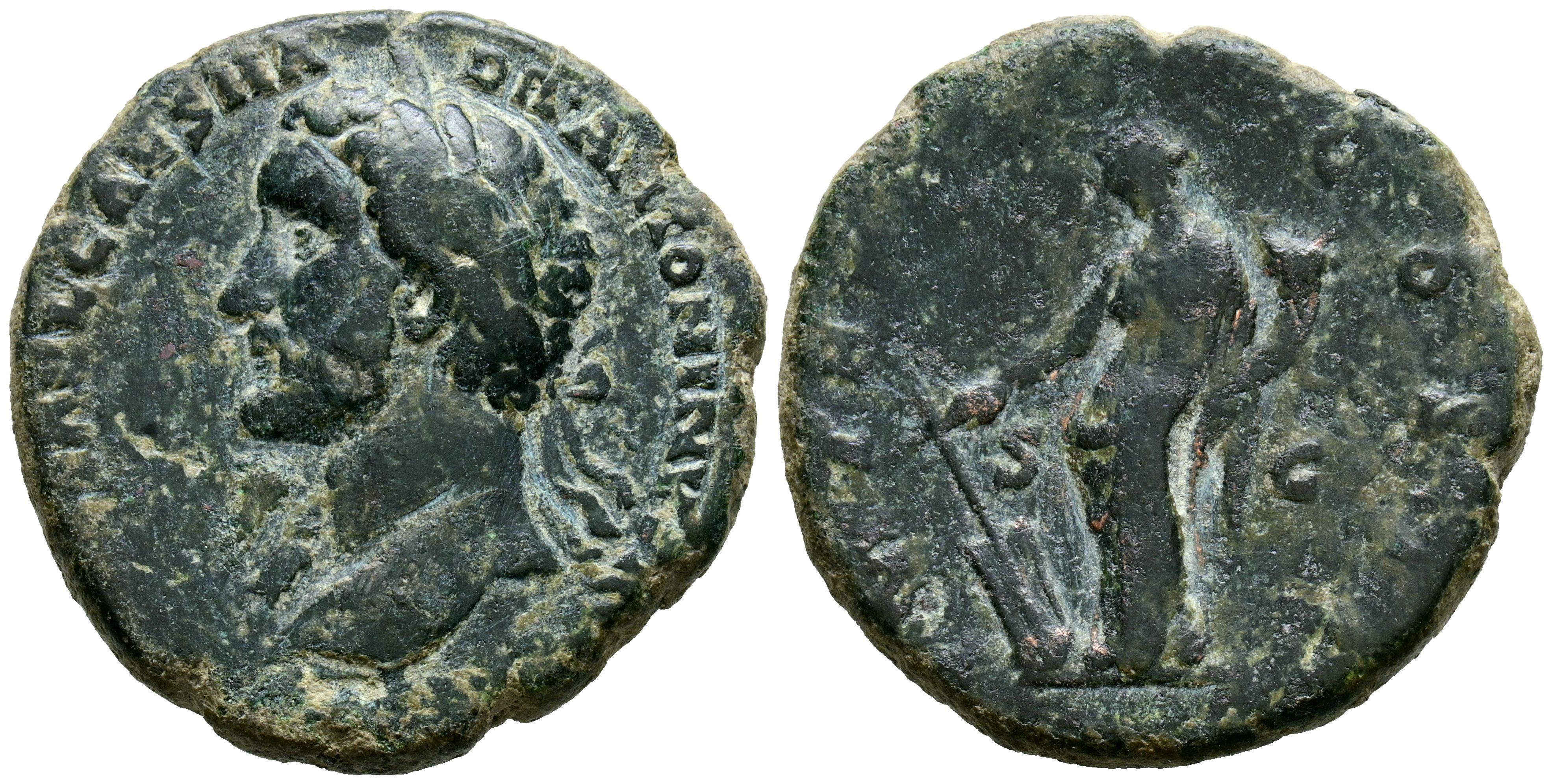 ANTONINUS PIUS. As. (Ae. 11.82g/27mm). 139 AD Rome. (RIC 533b var). Obv: Laureate head of Antoninus Pius facing left, surrounding legend: IMP T AEL CAES HADRI ANTONINVS AVG PIVS. Rev: Fortuna standing left carrying a corcupotia and helm, in a Uncirculated field, surrounding legend: PM TR POT COS II. VF-/Fine. Rare example with the bust of the emperor facing left; we have no record of another example with this variant.