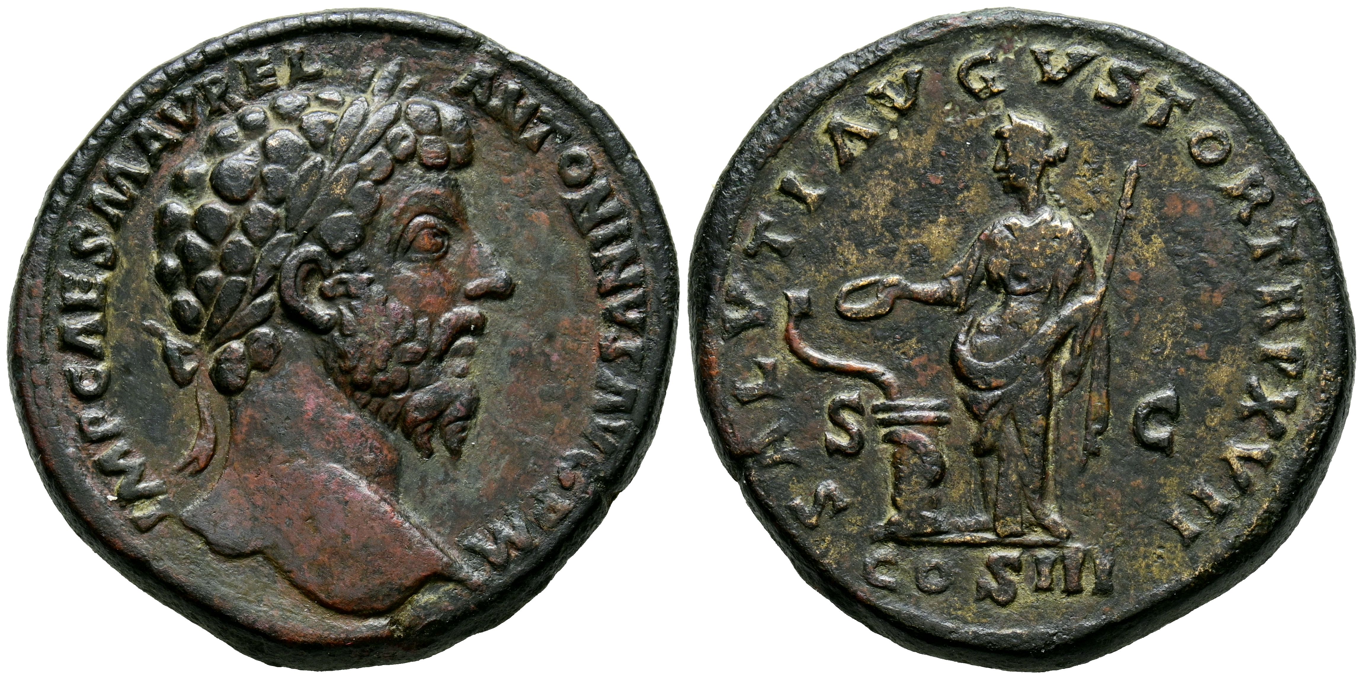 MAGoodUS AURELIUS. Sestertius. (Ae. 23.24g/32mm). 162-163 AD Rome. (RIC 844). Obv: Laureate head of Marcus Aurelius facing right, around legend: IMP CAES M AVREL ANTONINVS AVG P M. Rev: Salus standing left carrying a caduceus and feeding a serpent over the altar, between Uncirculated, around legend: SALVTI AVGVSTOR TR P XVII, in exergue: COS III. VF. Cleaned. Ex Soler y LLach & Martí Hervera, Auction 1077 (02/07/2013), Lot No. 178.