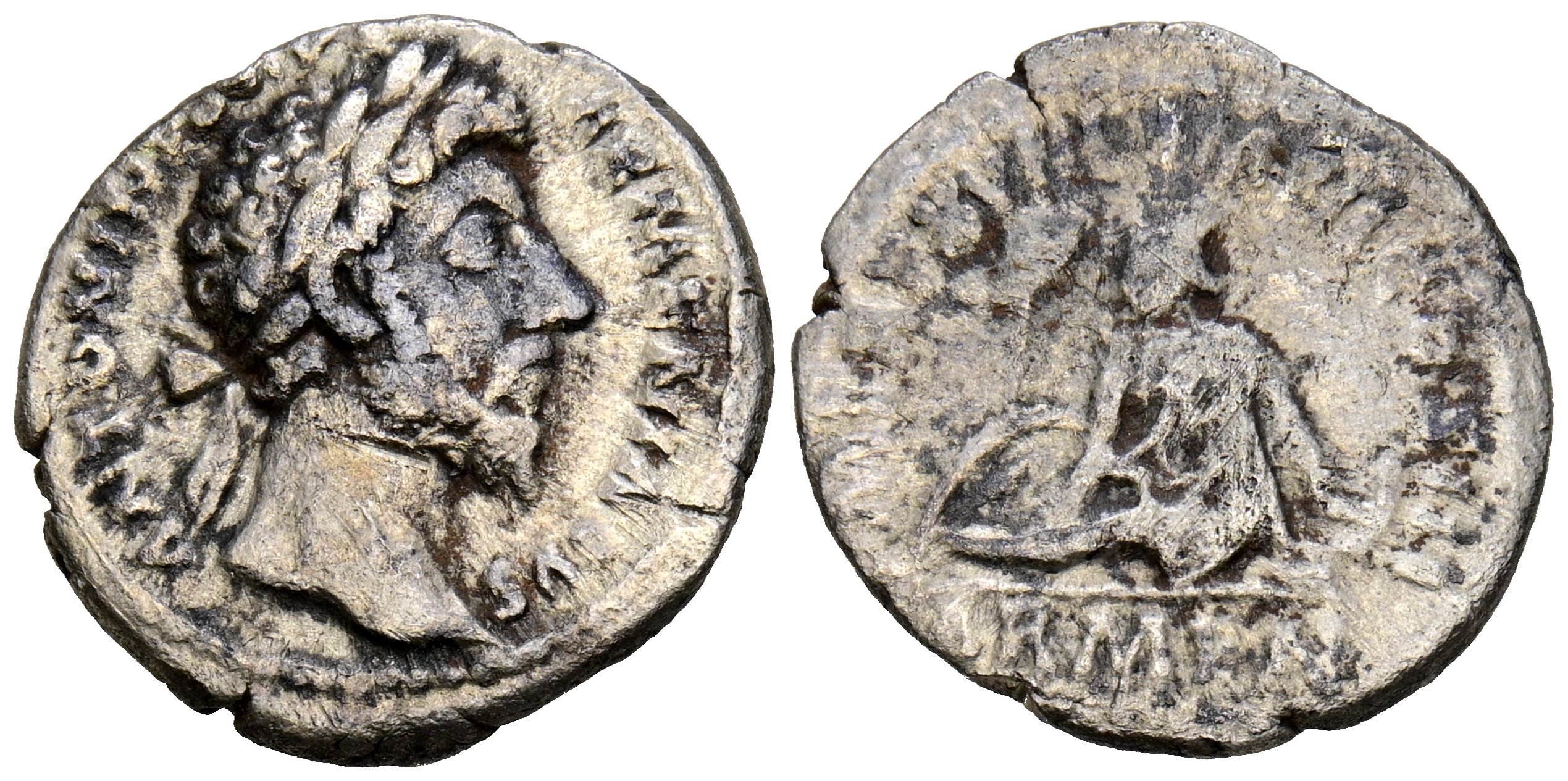 English MAGoodUS AURELIUS. Denarius. (Ar. 2.68g/18mm). 163-164 AD (RIC 81). Rome. Obv: ANTONINVS AVG ARMENICVS. Laureate bust facing right of Marcus Aurelius. Rev: Armenia seated on the ground facing left, behind banner and shield, in exergue: ARMEN, around legend: PM TR P XVIII IMP II COS III. VF-/VF+. Strong blow on the edge.