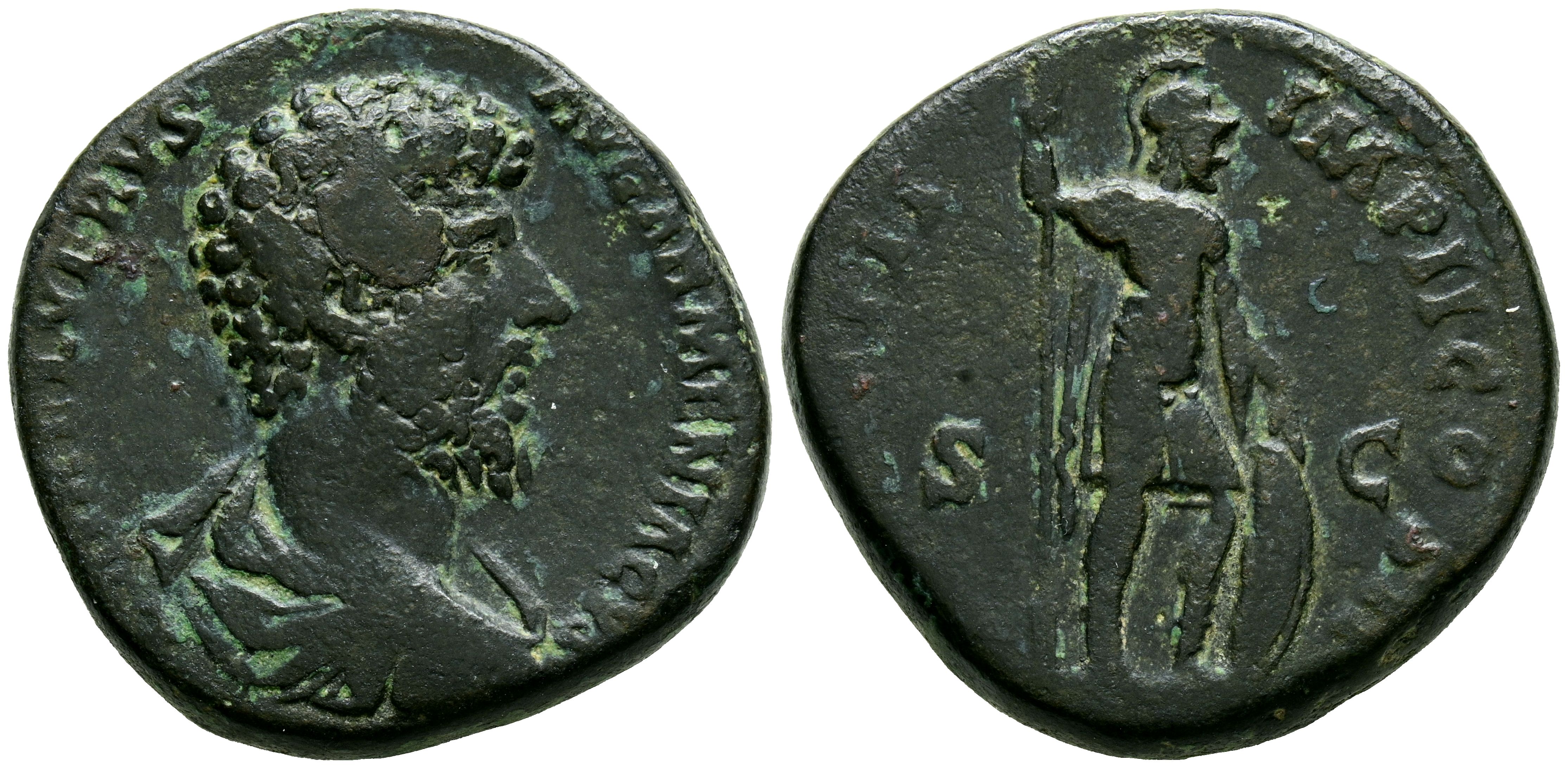 LUCIUS VERUS. Sestertius. (Ae. 25.13g/31mm). 163-164 AD Rome. (RIC 1385). Obv: Laureate bust of Lucius Verus facing right, around legend: L AVREL VERVS AVG ARMENIACVS. Rev: Mars standing right carrying spear and shield, around legend: TR P IIII IMP II COS II. VF-.