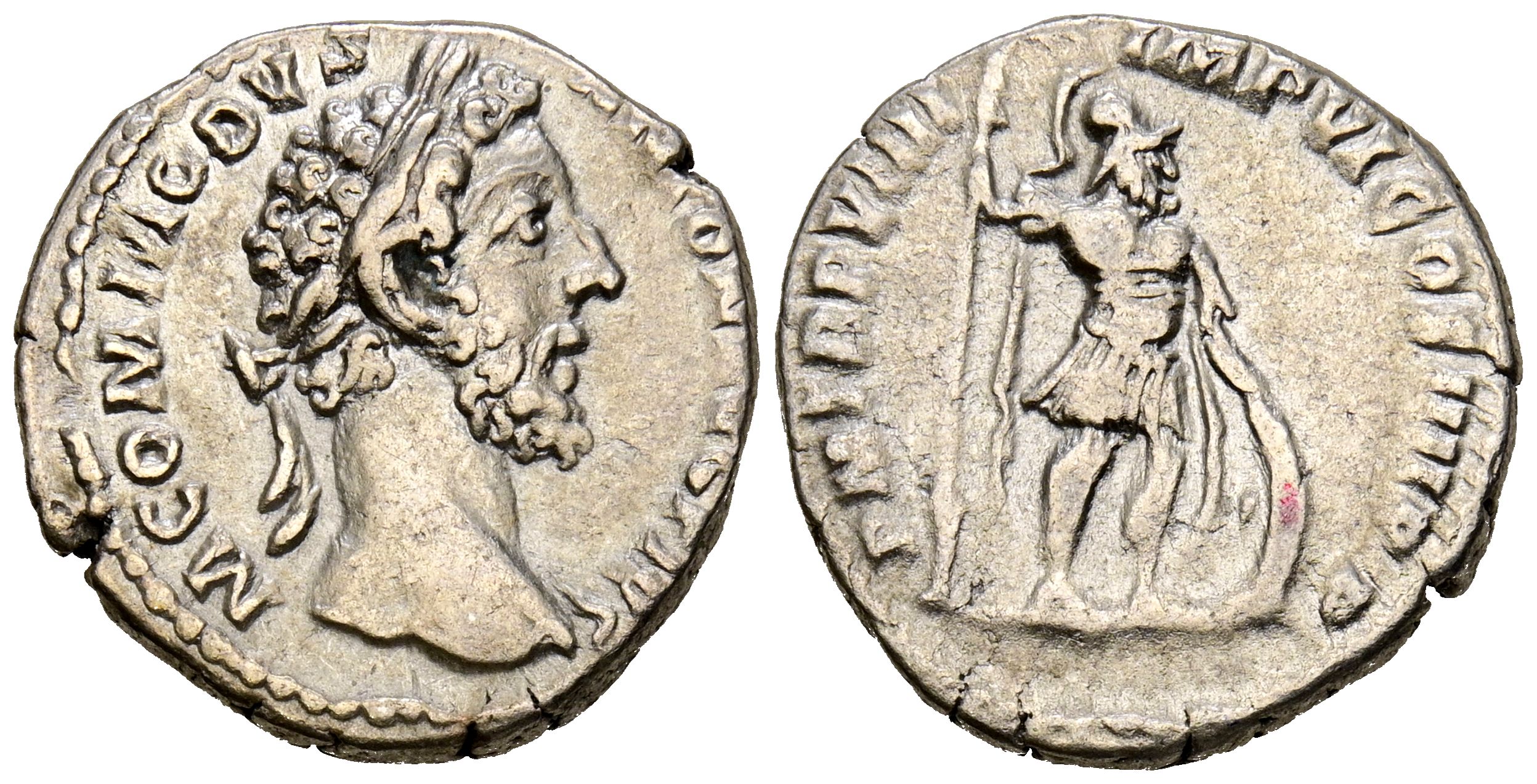 English COMMODUS. Denarius. (Ar. 3.37g/17mm). 183-184 AD Rome. (RIC 71). Obv: Laureate head of Commodus facing right, surrounding legend: M COMMODVS ANTON AVG PIVS. Rev: Mars standing right carrying spear and shield, surrounding legend: PM TR P VIIII IMP VI COS IIII P P. Very Fine.