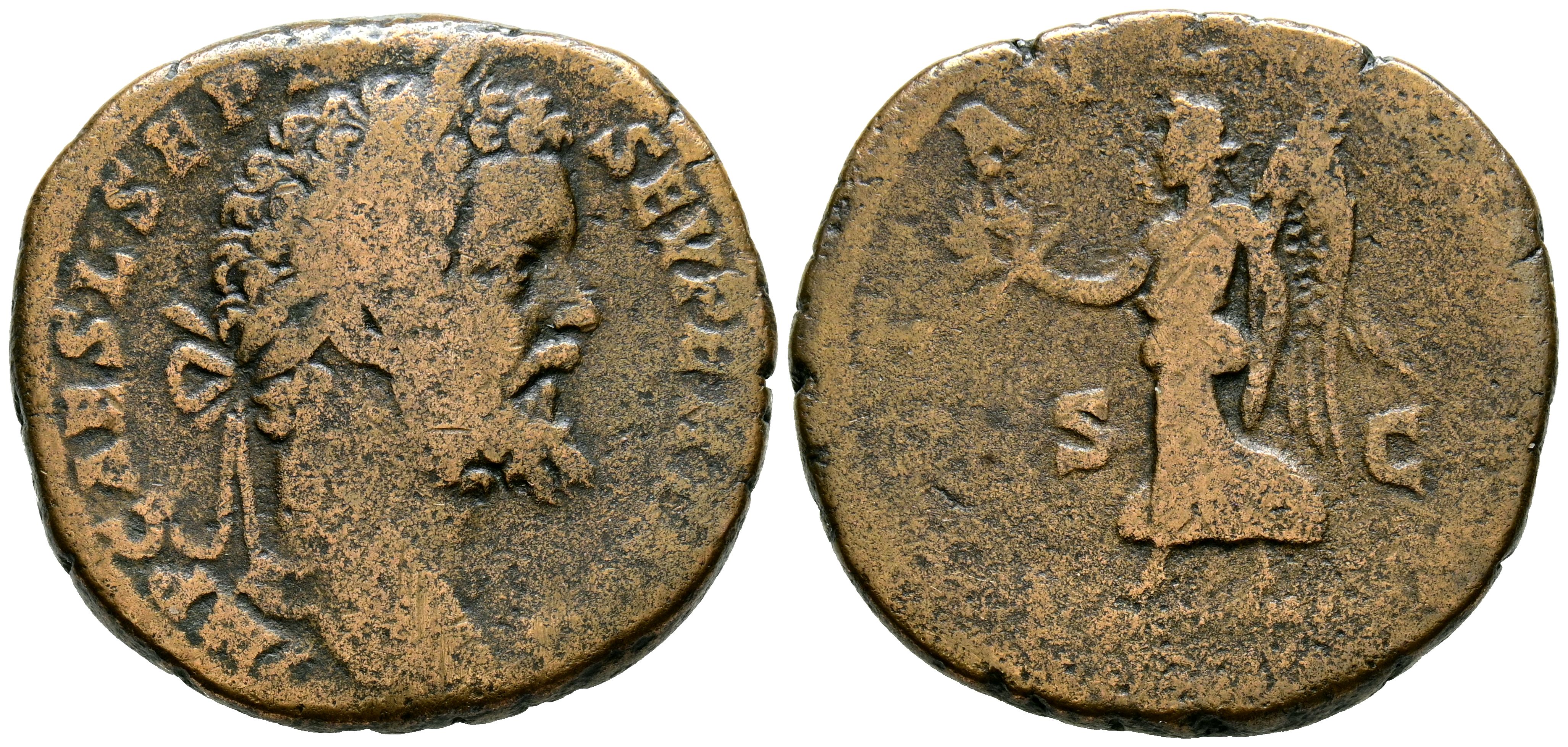 SEPTIMUS SEVERUS. Sestertius. (Ae. 14.63g/29mm). 193 AD Rome. (RIC 656). Obv: Laureate and cuirassed bust of Septimius Severus facing right, surrounding legend: IMP CAES L SEPT SEV PER AVG. Rev: Victory advancing left carrying laurel wreath and palm, between: Uncirculated, surrounding legend: VICT AVG TR P COS. VF-/Fine.