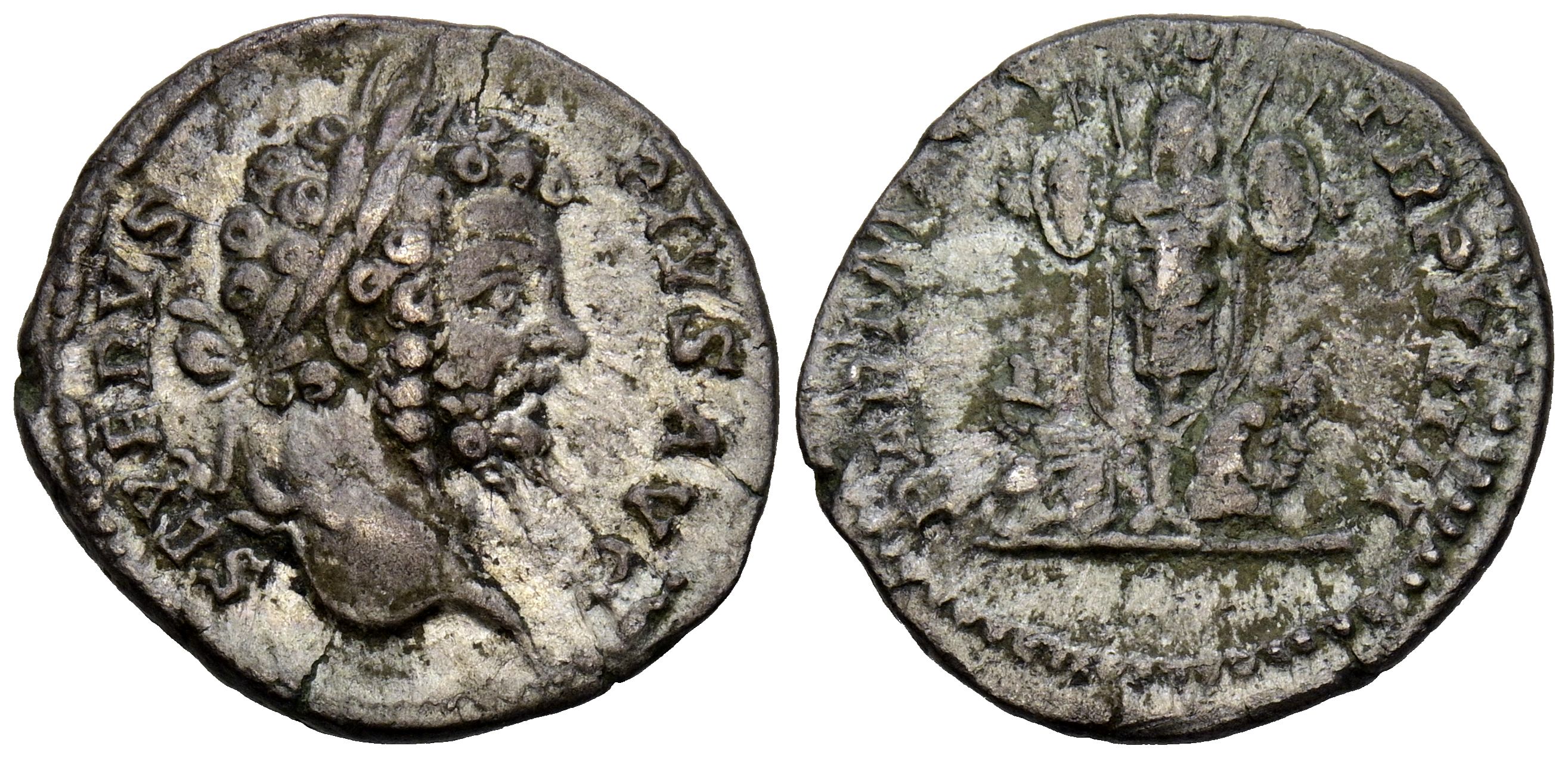 English SEPTIMUS SEVERUS. Denarius. (Ar. 3.13g/18mm). 201 AD Rome. (RIC 176). Obv: Laureate head of Septimius Severus facing right, surrounding legend: SEVERVS PIVS AVG. Rev: Trophy between two seated captives, surrounding legend: PART MAX PM TR P VIIII. VF.