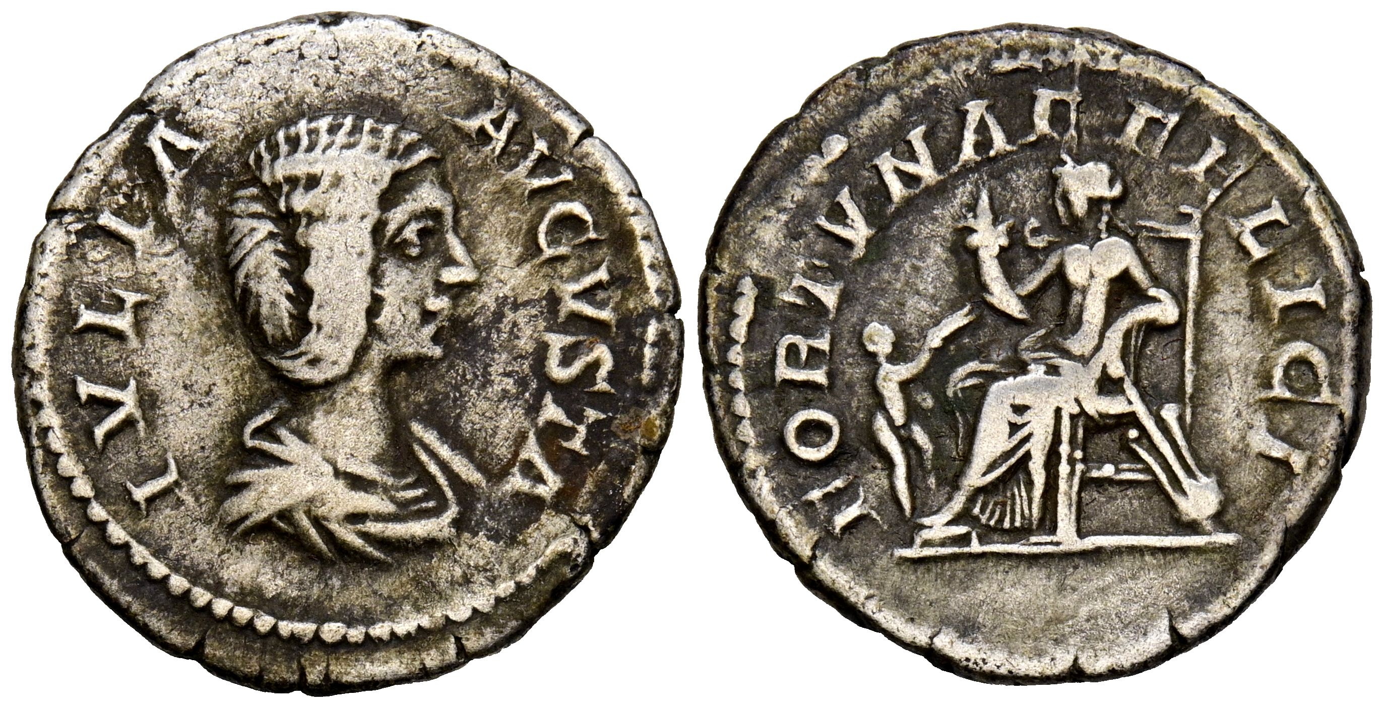 JULIA DOMNA. Denarius. (Ar. 3.07g/19mm). 196-211 AD Rome. (RIC 554). Obv: Draped bust of Julia Domna facing right, surrounding legend: IVLIA AVGVSTA. Rev: Fortuna seated facing left, carrying a cornucopia and leaning on a helm, with a child at her feet, surrounding legend: FORTVNAE FELICI. VF-.