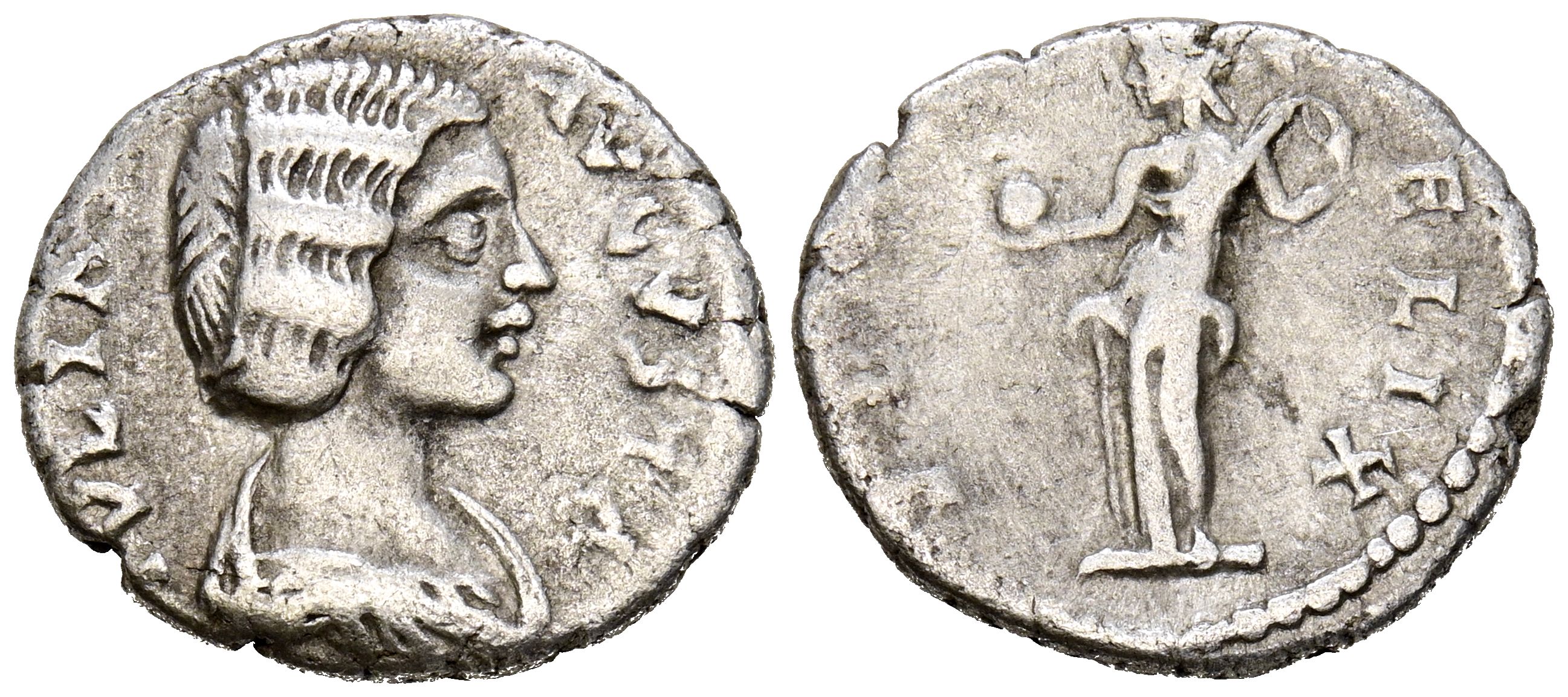 English JULIA DOMNA. Denarius. (Ar. 2.61g/18mm). 196-211 AD Rome. (RIC 580). Obv: Draped bust of Julia Domna facing right, around legend: IVLIA AVGVSTA. Rev: Venus standing left holding an apple and draped, around legend: VENVS FELIX. VF-.