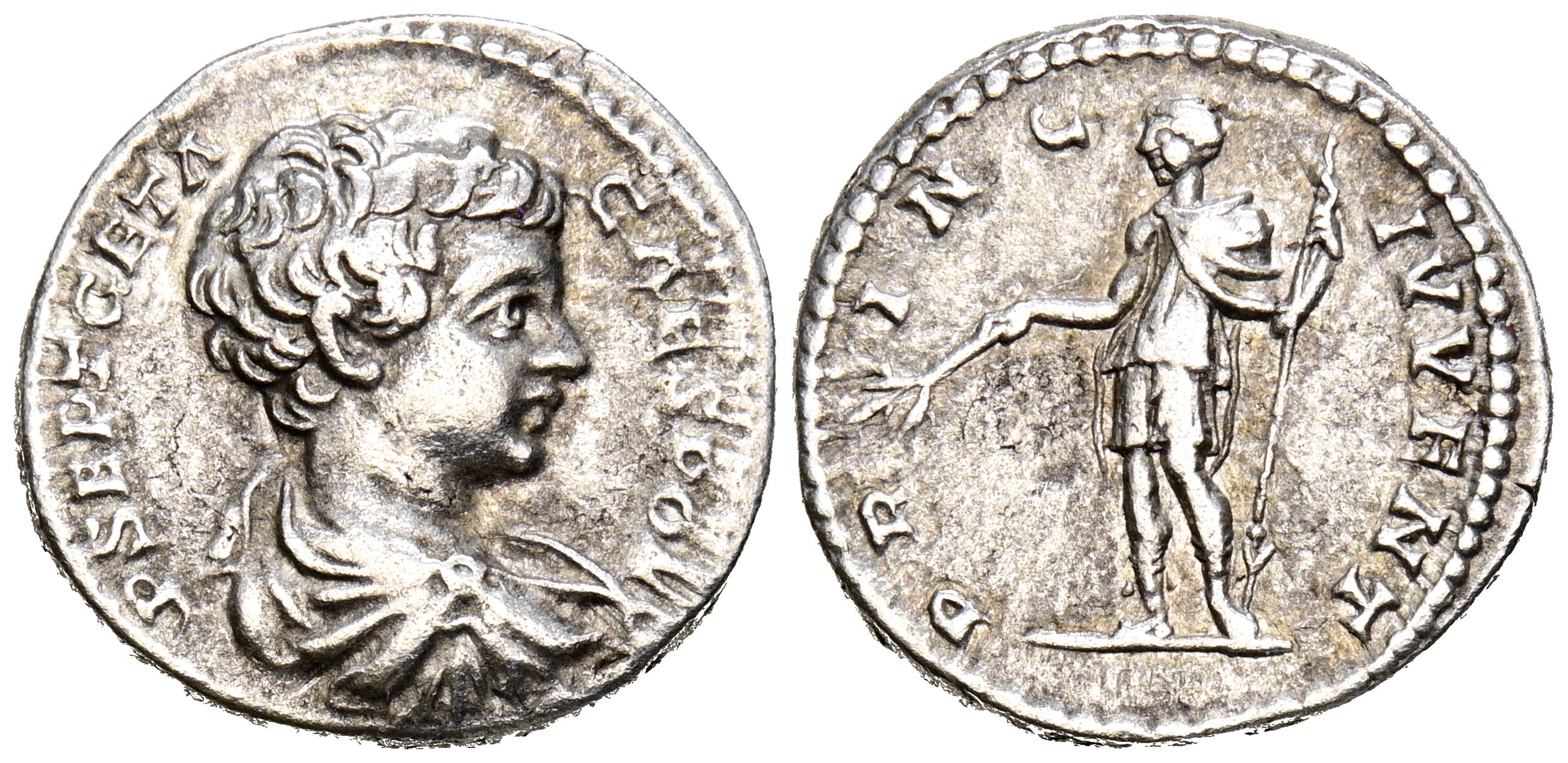 GETA. Denarius. (Ar. 3.22g/20mm). 201 AD Rome. (RIC 15b). Obv: Draped bust of Geta facing right, around the legend: P SEPT GETA CAES PONT. Rev: Geta standing left holding a sceptre and olive branch, around the legend: PRINC IVVENT. VF+.