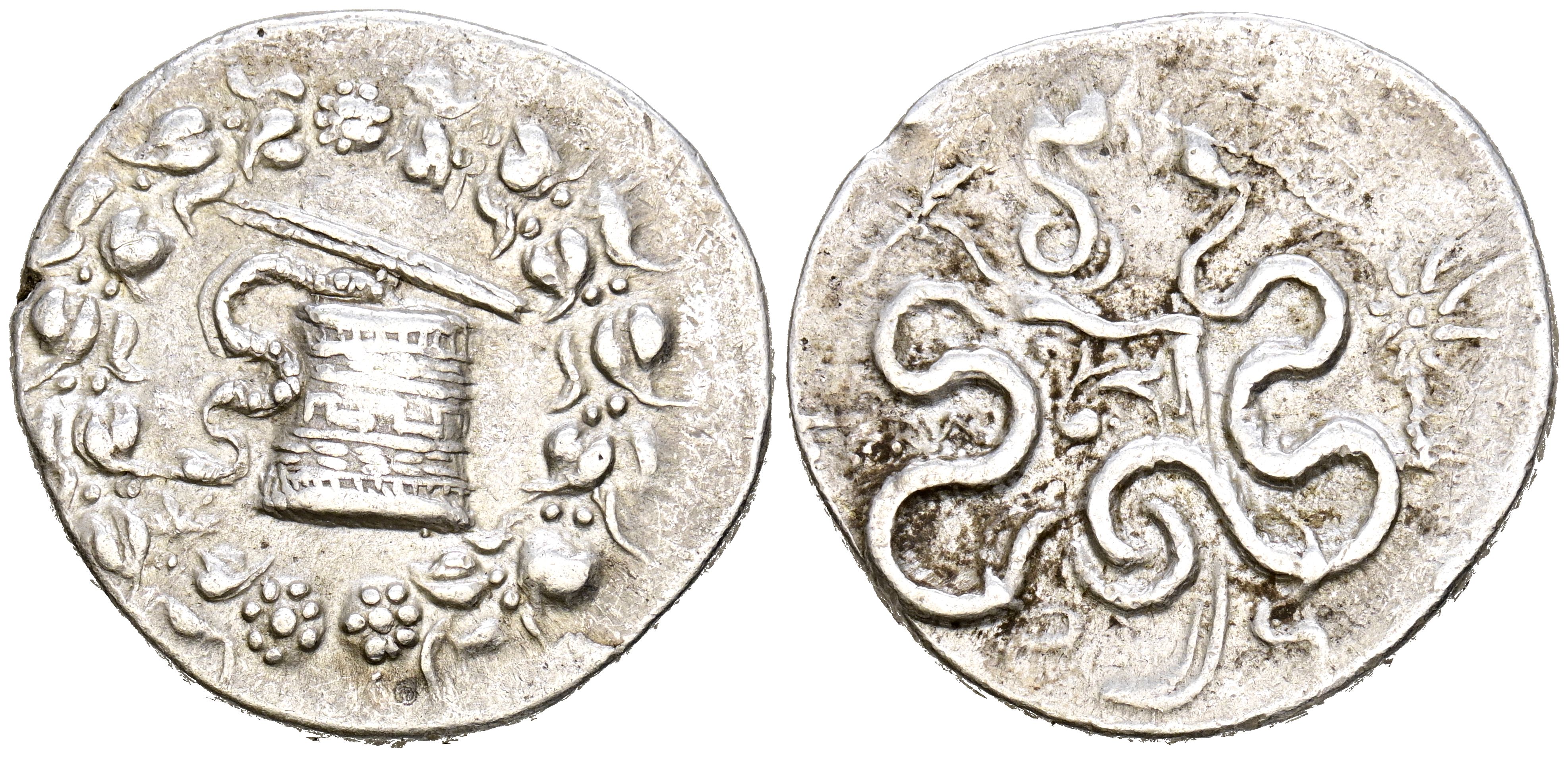 English PERGAMON. Tetradrachm. (Ar. 12.67g/27mm). 133-67 Fine (SNG Paris 1729) Obv: Mystical basket with a half-open lid from which a serpent emerges to the left; around it, an ivy wreath with fruit. Rev: Two serpents coiled around a bow; on the left, the Pergamon monogram, on the right, thyrsuses. VF.