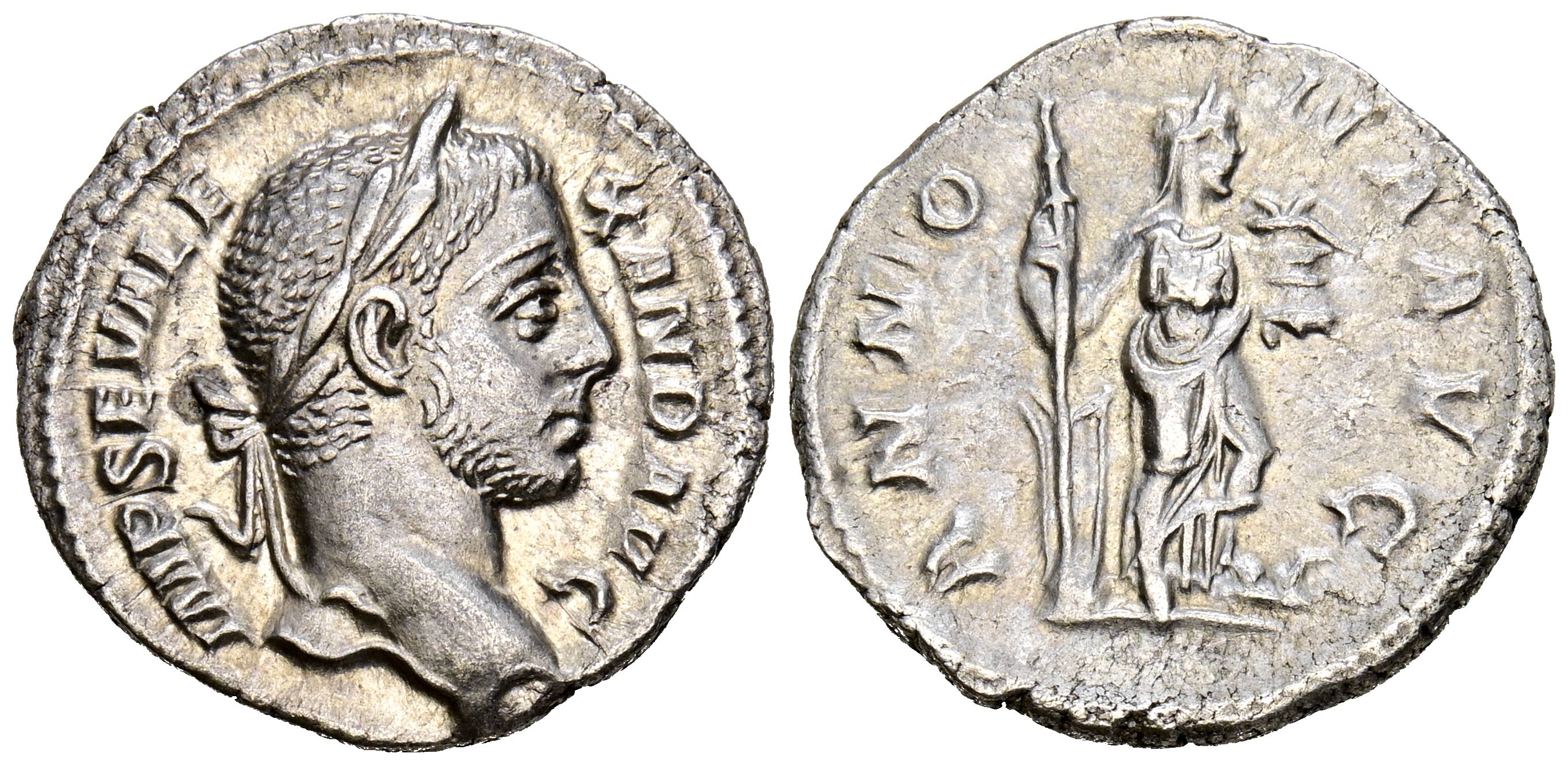 ALEXANDER SEVERUS. Denarius. (Ar. 3.03g/19mm). 229 AD Rome. (RIC 190). Obv: Laureate bust of Alexander Severus facing right, surrounding legend: IMP SEV ALEXAND AVG. Rev: Annona standing right, modius and rudder, surrounding legend: ANNONA AVG. VF+.