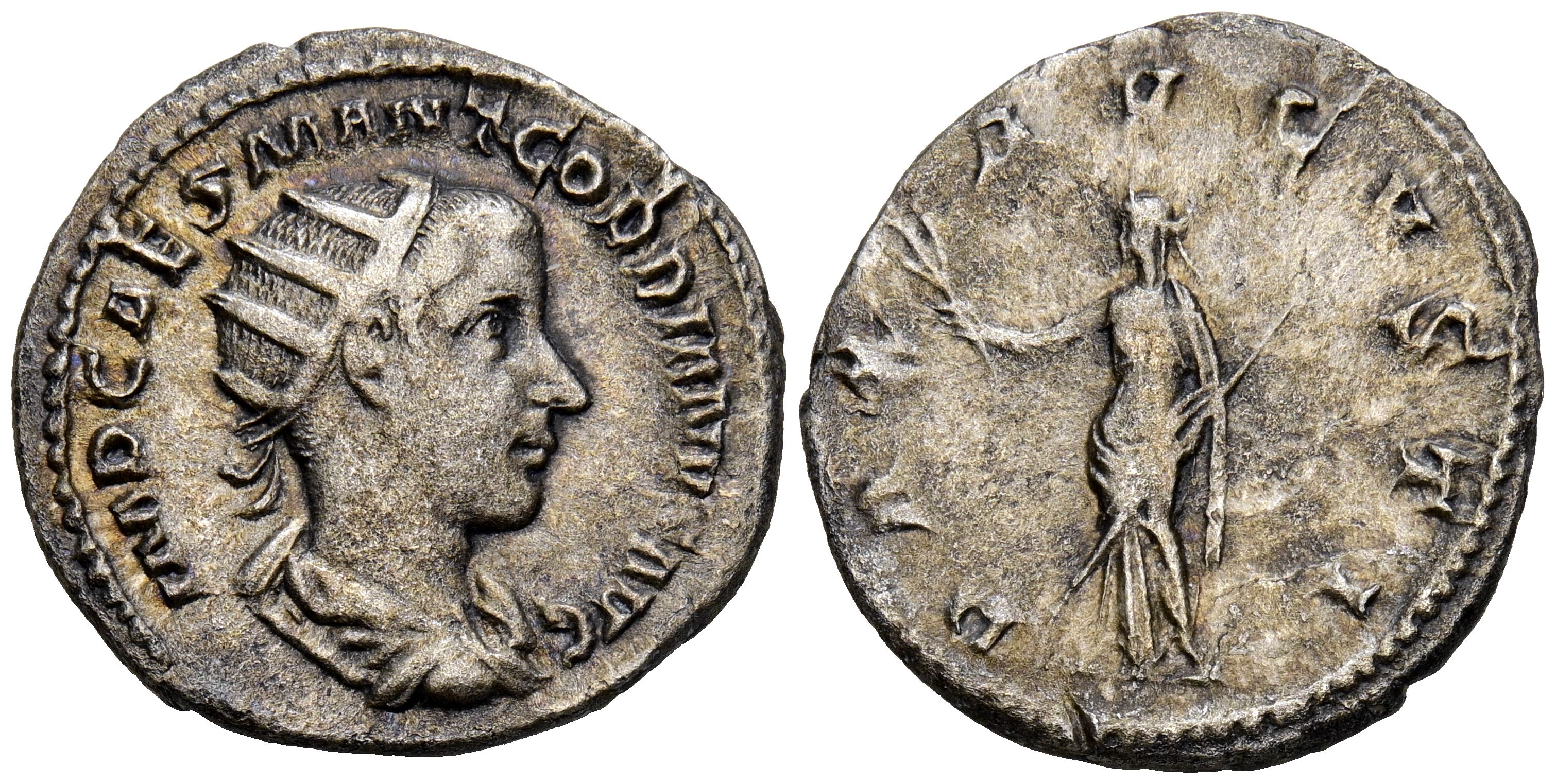 GORDIAN III. Antoninianus. (Ar. 4.27g/21mm). 238-239 AD Rome. (RIC 3). Obv: Radiated and draped bust of Gordian III facing right, surrounding legend: IMP CAES M ANT GORDIANVS AVG. Rev: Pax standing left holding a sceptre and palm tree, surrounding legend: PAX AVGVSTI. VF. Tone.