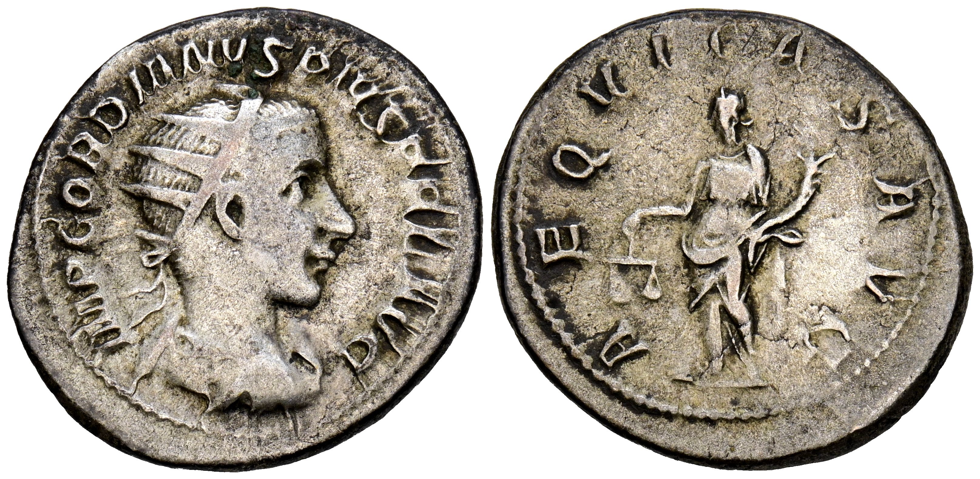 English GORDIAN III. Antoninianus. (Ar. 4.65g/23mm). 240 AD Rome. (RIC 63). Obv: Radiated and draped bust of Gordian III facing right, surrounding legend: IMP GORDIANVS PIVS FEL AVG. Rev: Aequitas standing left carrying scales and cornucopia, surrounding legend: AEQVITAS AVG. VF-.