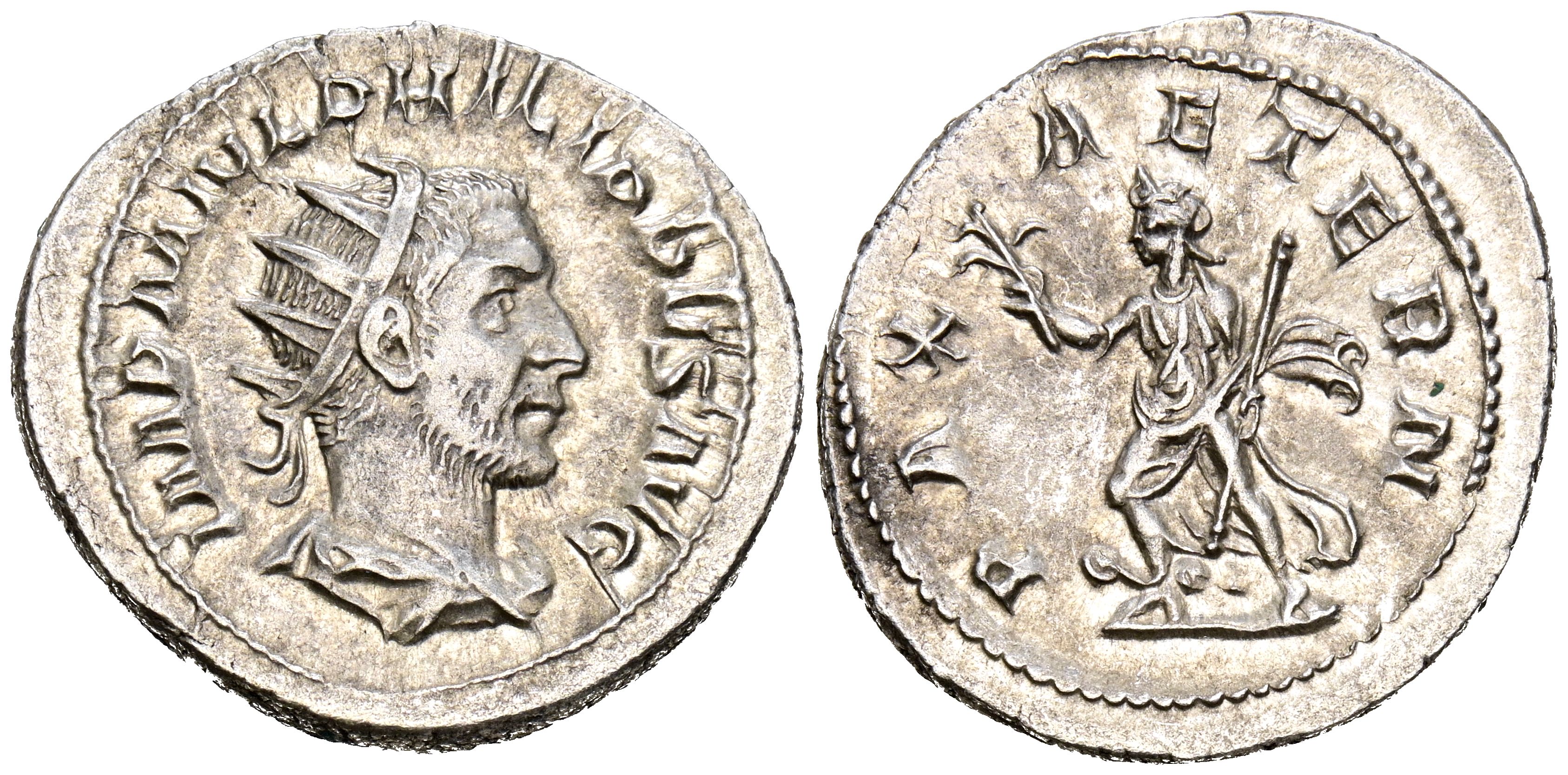 PHILIP I. Antoninianus. (Ar. 4.48g/24mm). 244 AD Rome. (RIC 41). Obv: Radiated and draped bust of Philip I, around the legend: IMP M IVL PHILIPPVS AVG. Rev: Pax advancing to the left carrying a branch and sceptre, around the legend: PAX AETERN. Extremely Fine-.