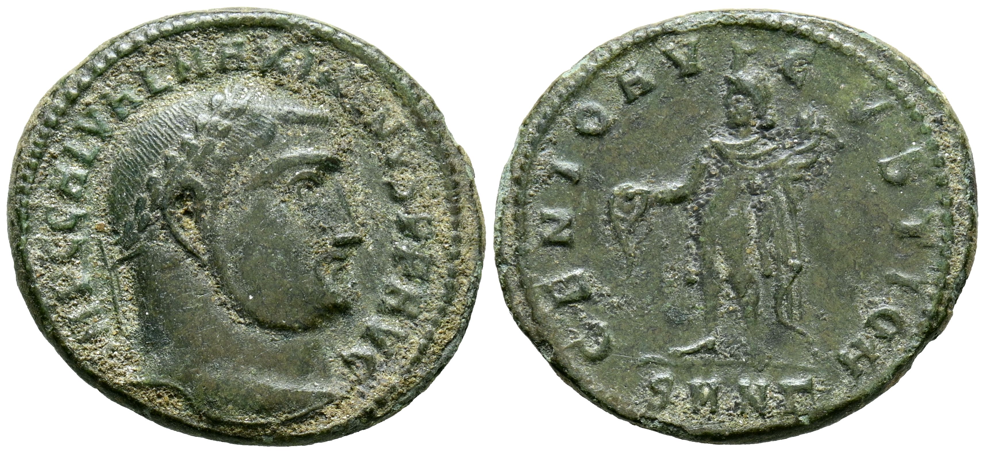 MAXIMIAN OF HEGoodULAEUS. Follis. (Ae. 5.86g/24mm). 296-297 AD Nicomedia. (RIC 54). Obv: Laureate head of Maximian facing right, around legend: IMP C GAL VAL MAXIMIANVS PF AVG. Rev: Genius standing left carrying a patera and cornucopia, in exergue: SMNr, around legend: GENIO AVGVSTI GM. VF-.