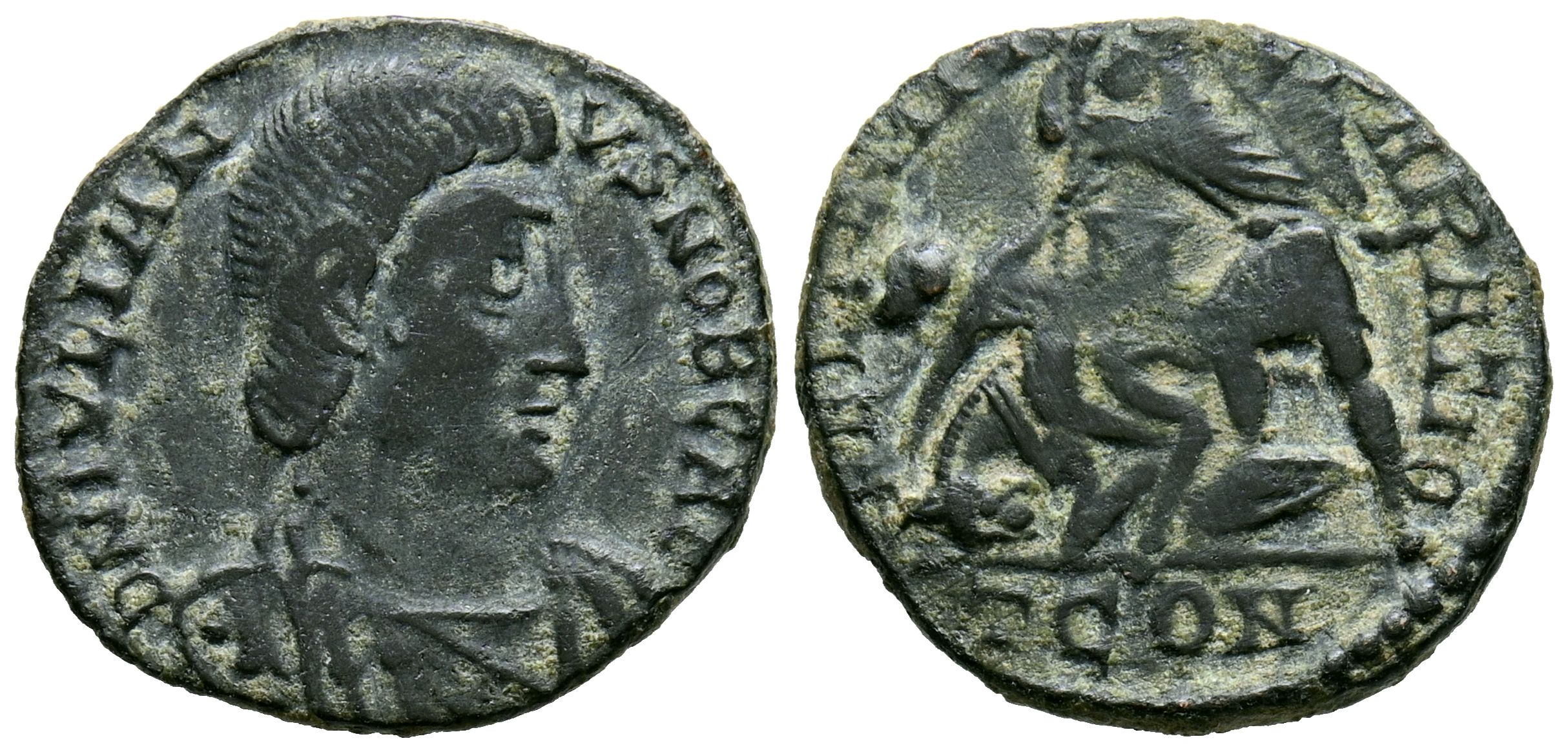 English JULIAN II. Follis. (Ae. 2.02g/18mm). 355-357 AD. Arelate. (RIC 274). Obv: Diademed, draped and cuirassed bust of Julian II facing right, surrounding legend: DN IVLIANVS NOB CAES. Rev: Julian II facing left spearing a rider at his feet; exergue: TCOM, surrounding legend: FEL TEMP REPARATIO. VF-.