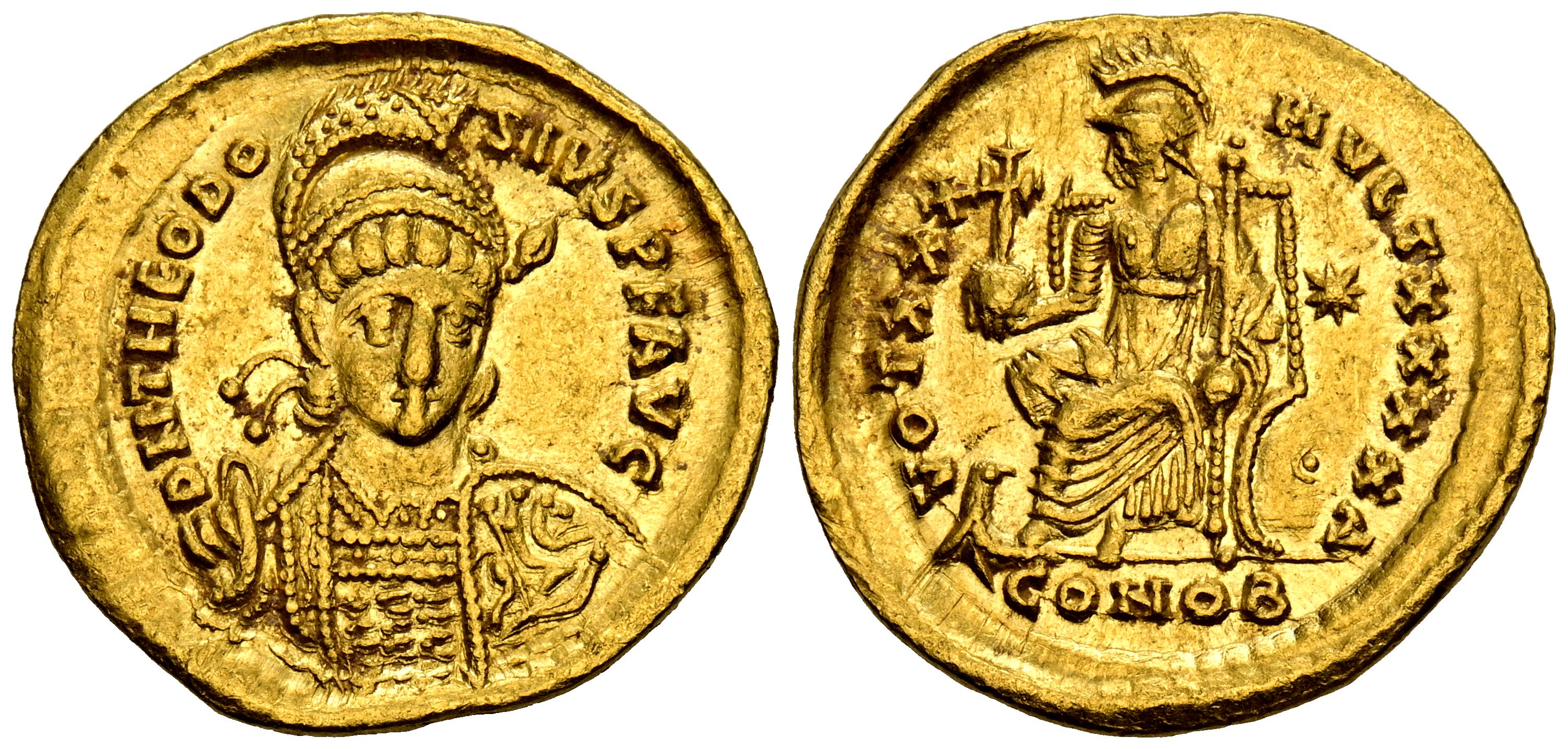 THEODOSIUS II. Solid. (Ae. 4.48g/21mm). 340-440 AD Constantinople. (RIC 257). Obv: Diademed and cuirassed bust of Theodosius II facing right holding a spear and a shield decorated with a horseman, around the edge legend: DN THEODOSIVS PF AVG. Rev: Constantinople seated on a throne facing left holding a cruciform globe and sceptre, resting her foot on a prow, behind her shield, in the field: a star, in the exergue: CONOB, around the edge legend: VOT XXX MVLT XXXX Δ. VF+.