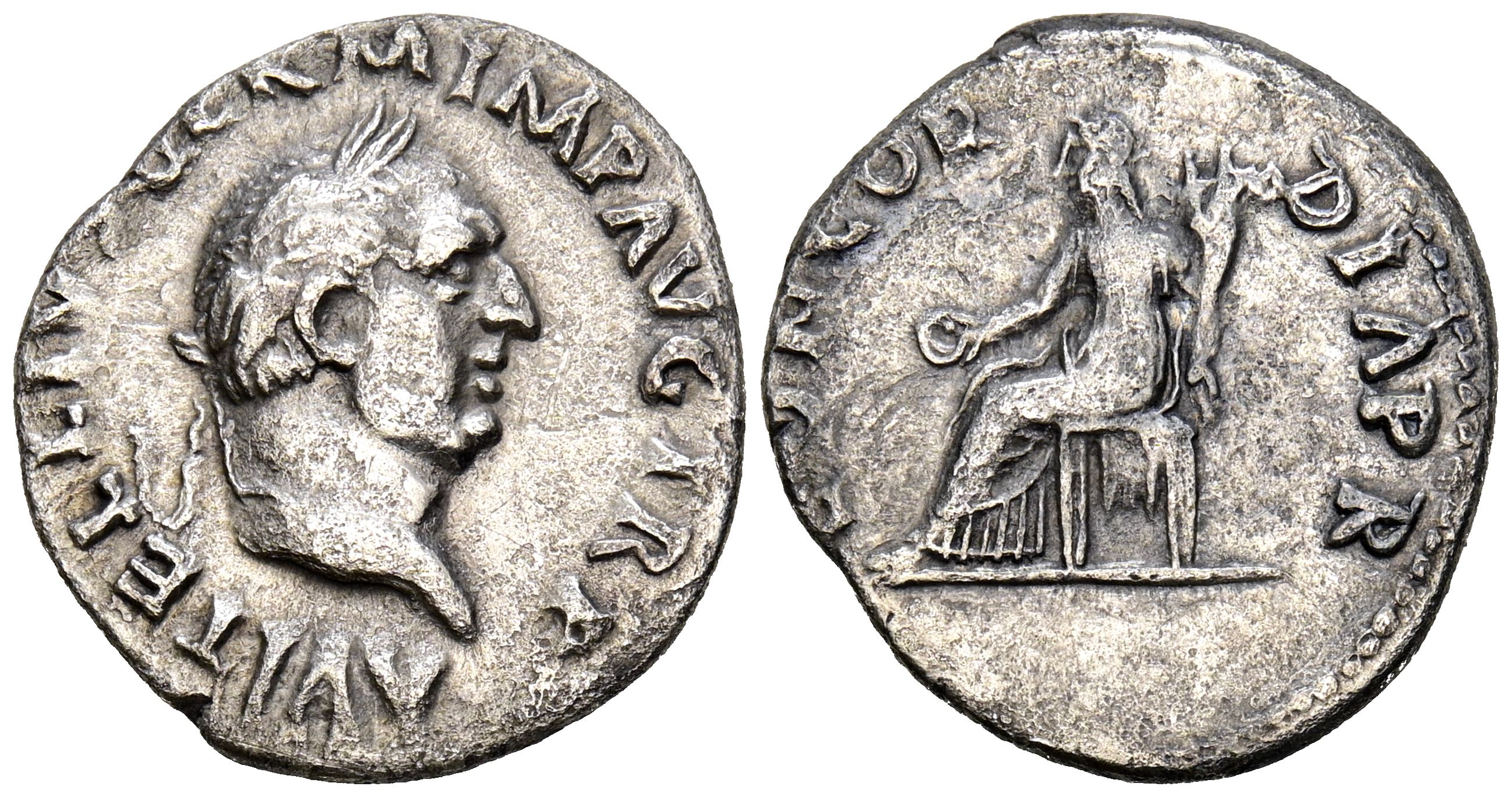 VITELLIUS. Denarius. (Ar. 3.19g/19mm). 69 AD Rome. (RIC 90). Obv: Laureate bust of Vitellius facing right, surrounding legend: A VITELLIVS GERMAN IMP AVG TR P. Rev: Concordia seated left carrying a small boat and cornucopia, surrounding legend: CONCORDIA PR. VF.
