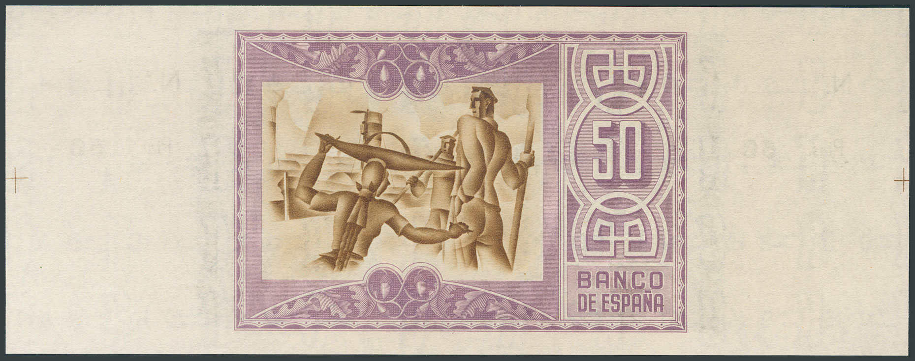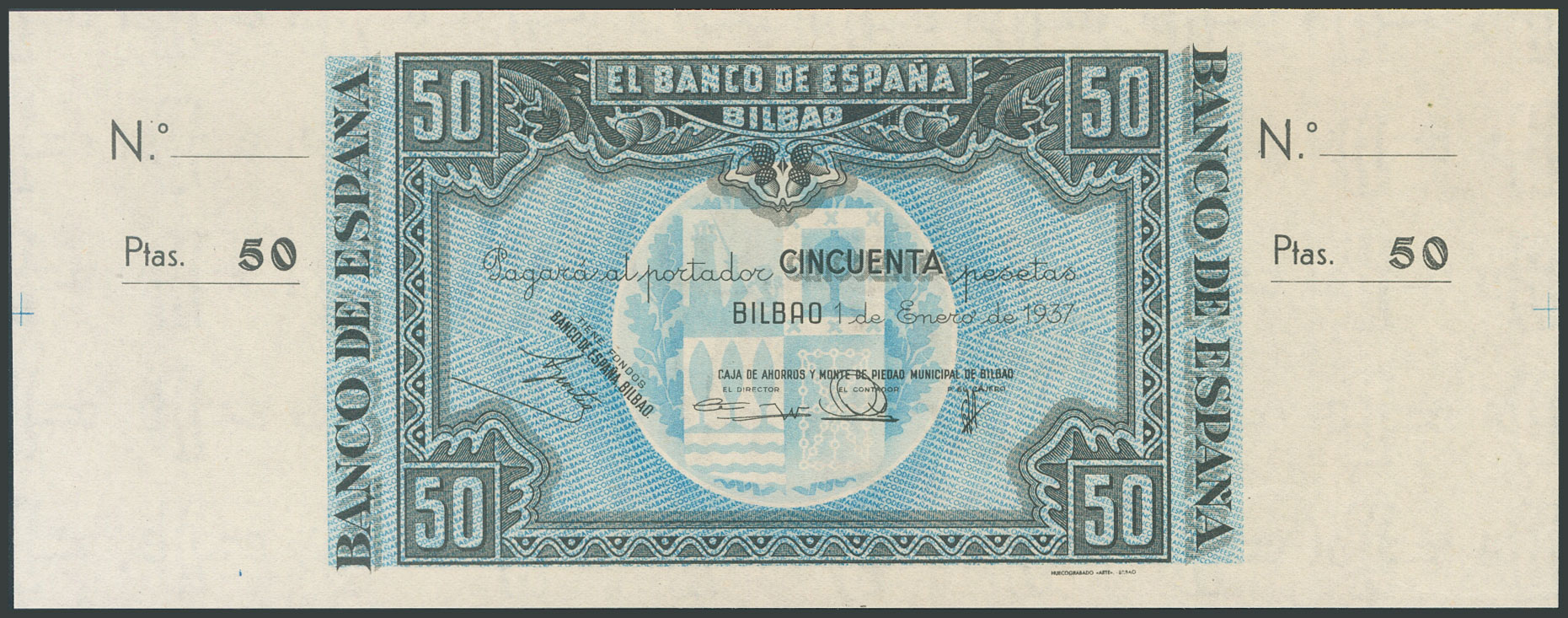 English 50 Pesetas. January 1, 1937. Bilbao Branch, signature of Caja de Ahorros y Monte de Piedad Municipal de Bilbao. No series or numbering, with both matrices. (Edifil 2017: 389c). Uncirculated-.