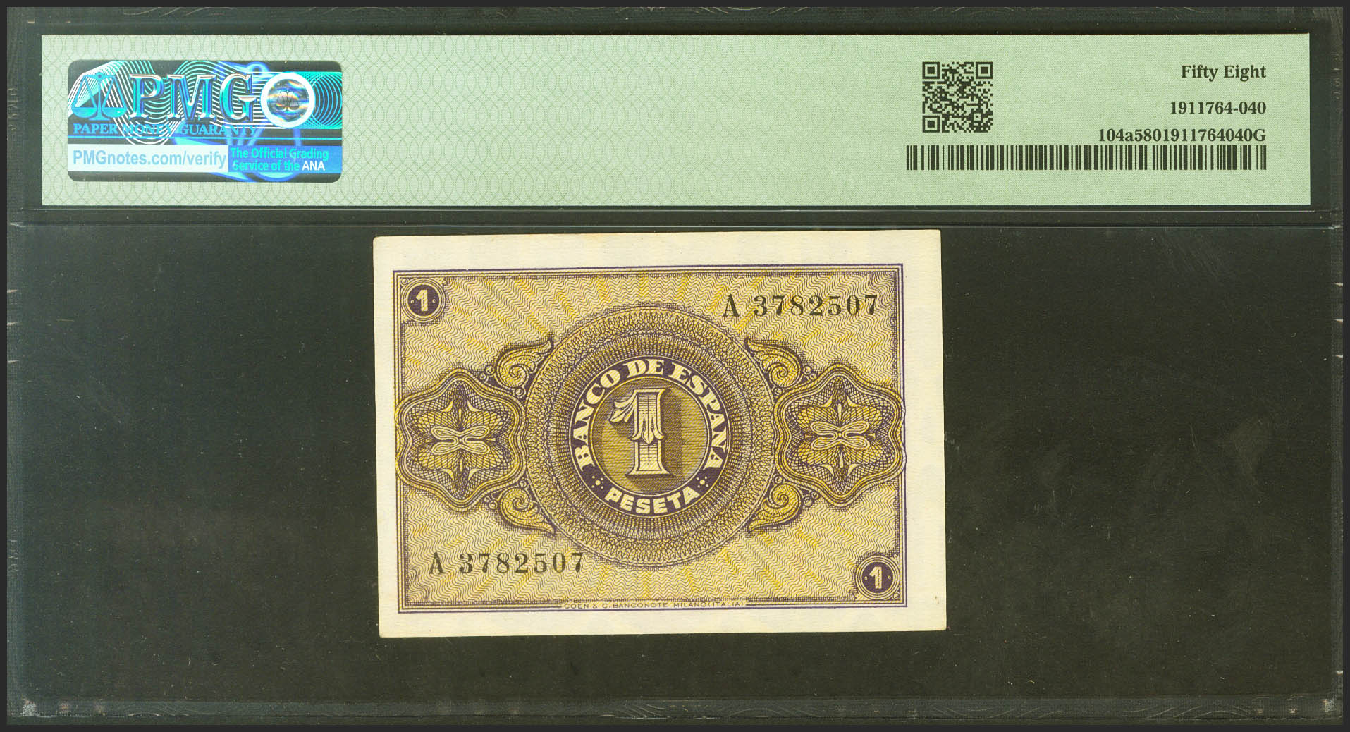 English 1 Peseta. October 12, 1937. Series A. (Edifil 2021: 425, Pick: 104a). Good Extremely Fine+. PMG58 package.