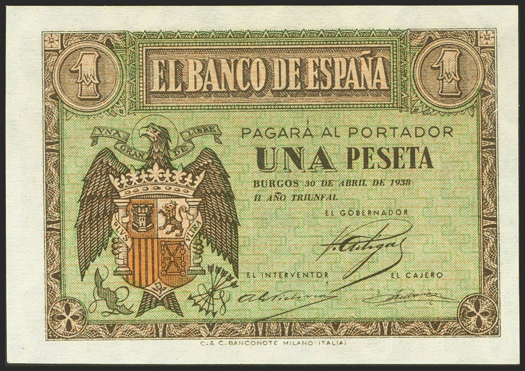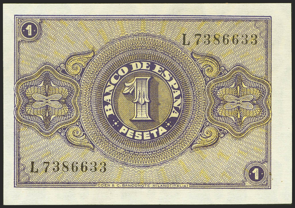 English 1 Peseta. April 30, 1938. Series L. (Edifil 2021: 428a). Original finish. Uncirculated.