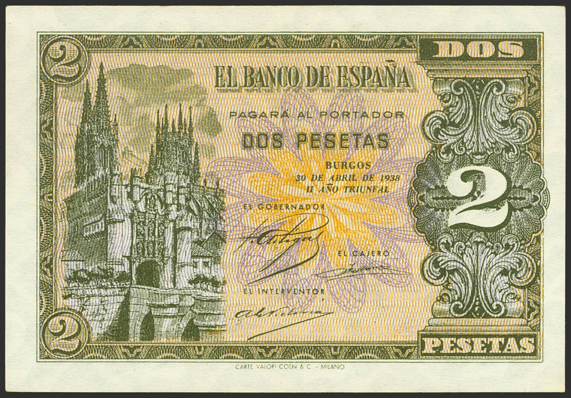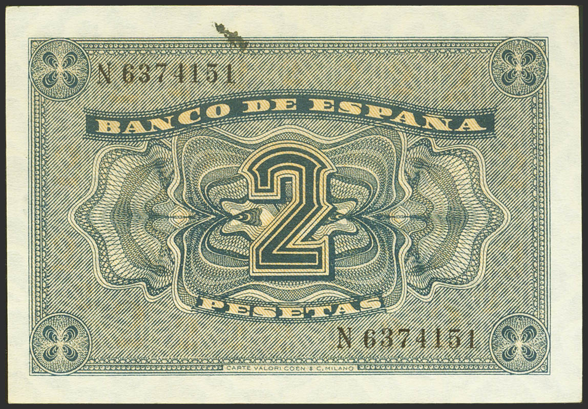 2 Pesetas. April 30, 1938. Series N, last series issued. (Edifil 2021: 429a). Original finish and small ink stain on the reverse from the printing process. Uncirculated.