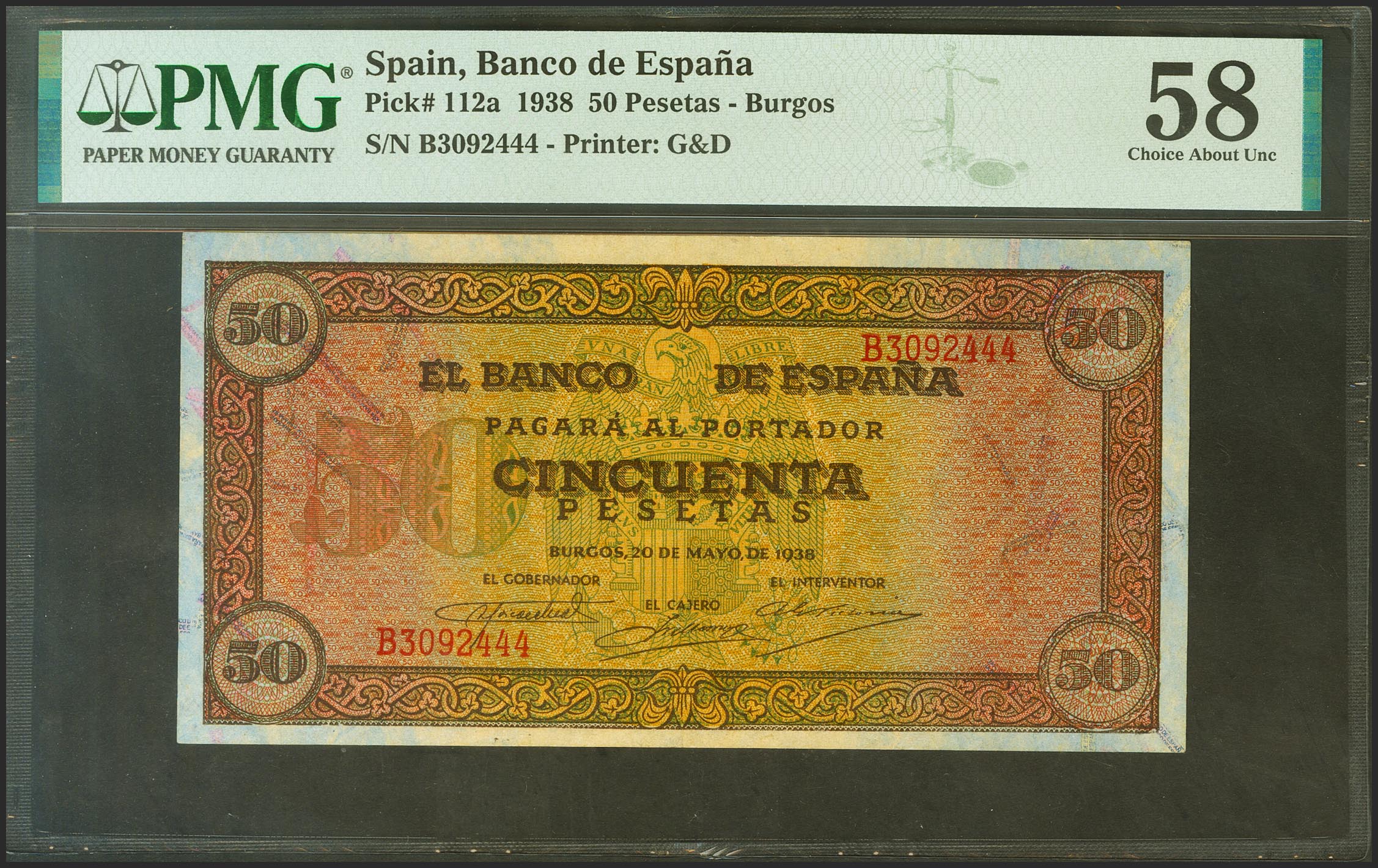 50 Pesetas. May 20, 1938. Series B. (Edifil 2021: 431a, Pick: 112a). Good Extremely Fine+. PMG58 package.