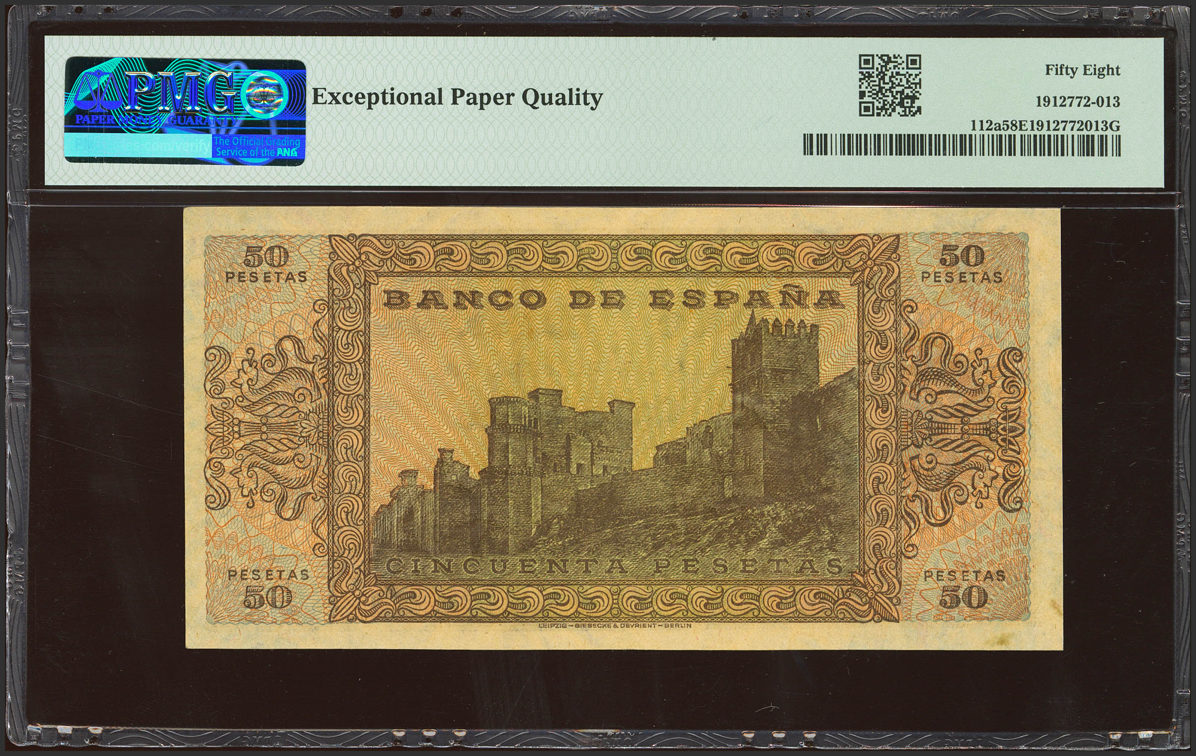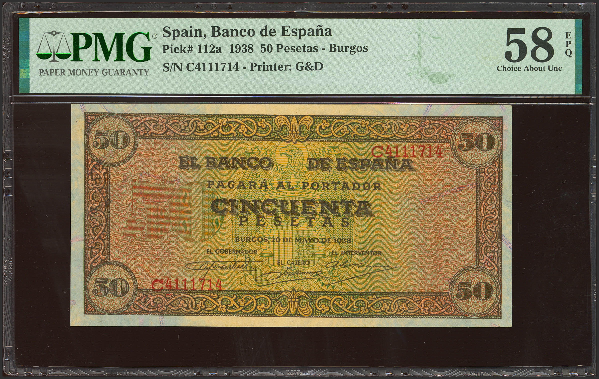 English 50 Pesetas. May 20, 1938. Series C. (Edifil 2021: 431a, Pick: 112a). Original finish. Good Extremely Fine++. PMG58EPQ capsule.